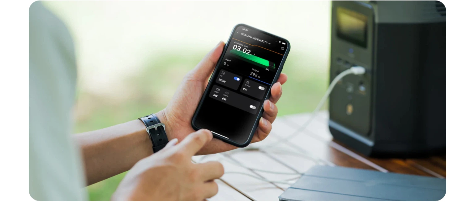 Отримуйте інформацію про відсоток заряду, час роботи та зарядки батареї Smart Extra Battery та вашої станції на вбудованому екрані. Перевірити стан акумулятора в додатку EcoFlow через підключення до Wi-Fi та Bluetooth.