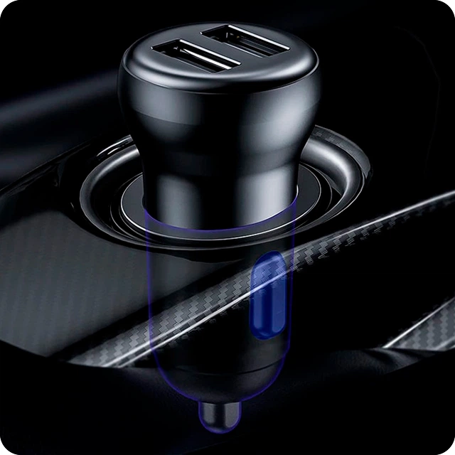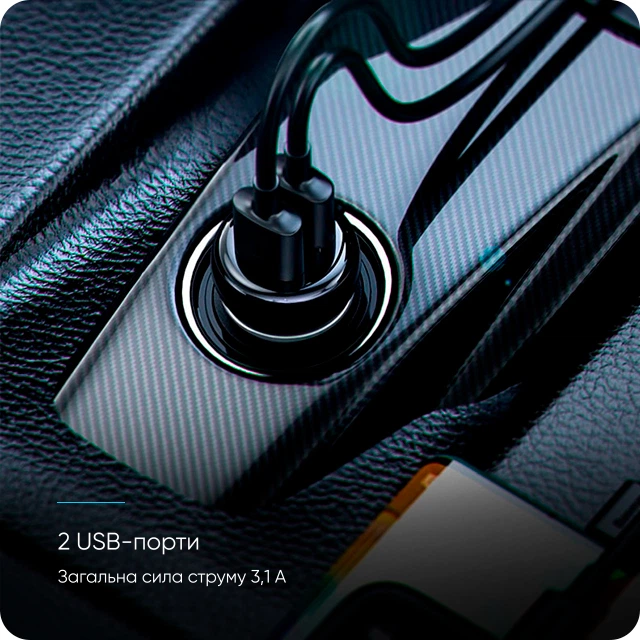 Зарядний пристрій живиться від прикурювача. Він міцно фіксується завдяки подовженій протиковзній шрапнелі й не вискакує на вибоїстих дорогах чи крутих поворотах.