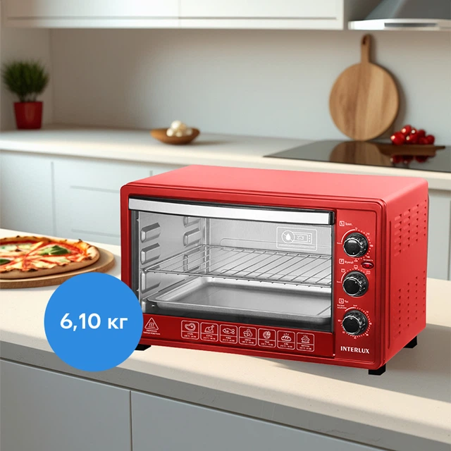 При потужності 1600 Вт піч залишається компактною та легкою, а завдяки габаритам (Ш × Г × В) — 555 × 420 × 386 мм зручно розміщується навіть на невеликій кухні.