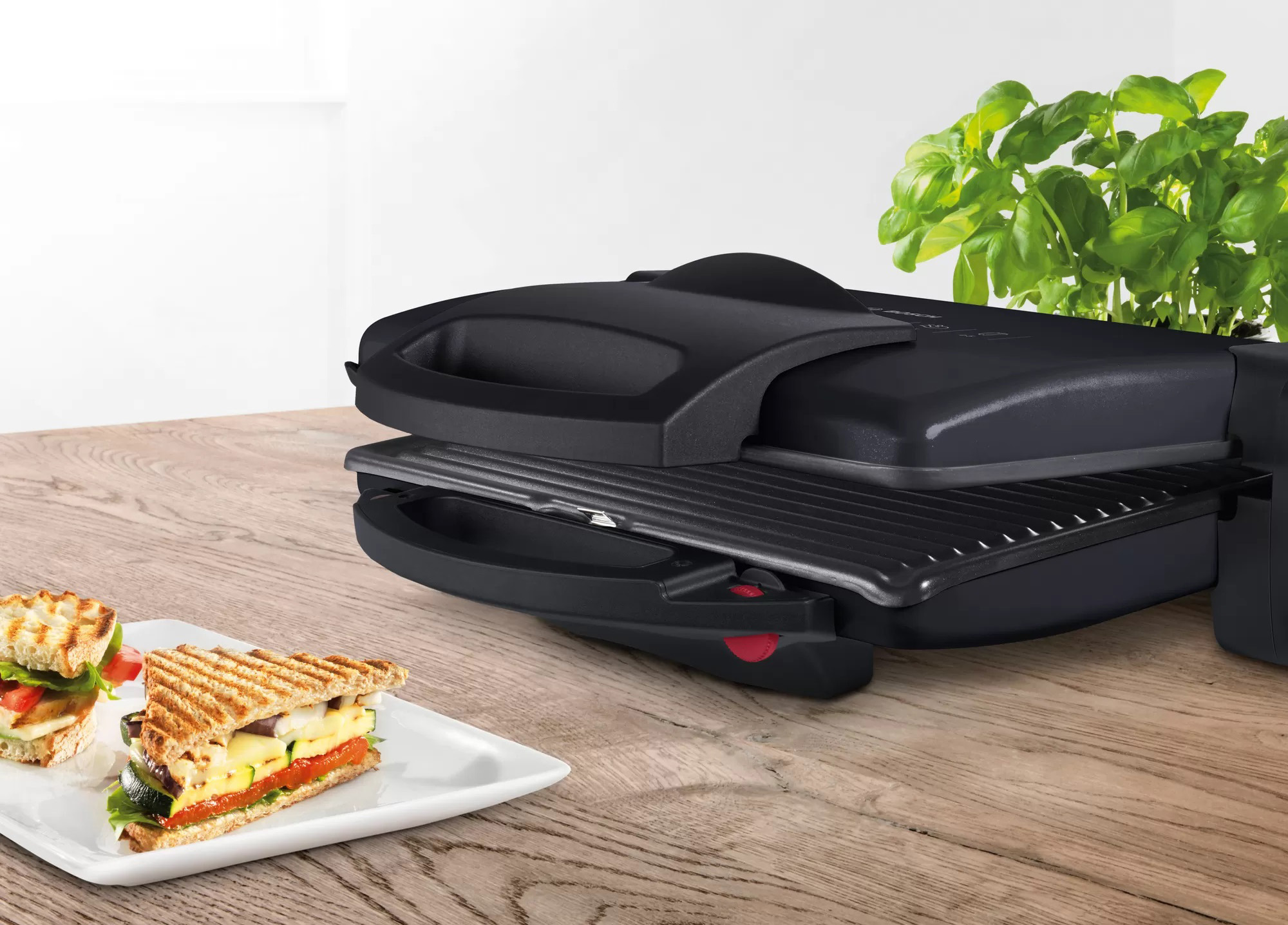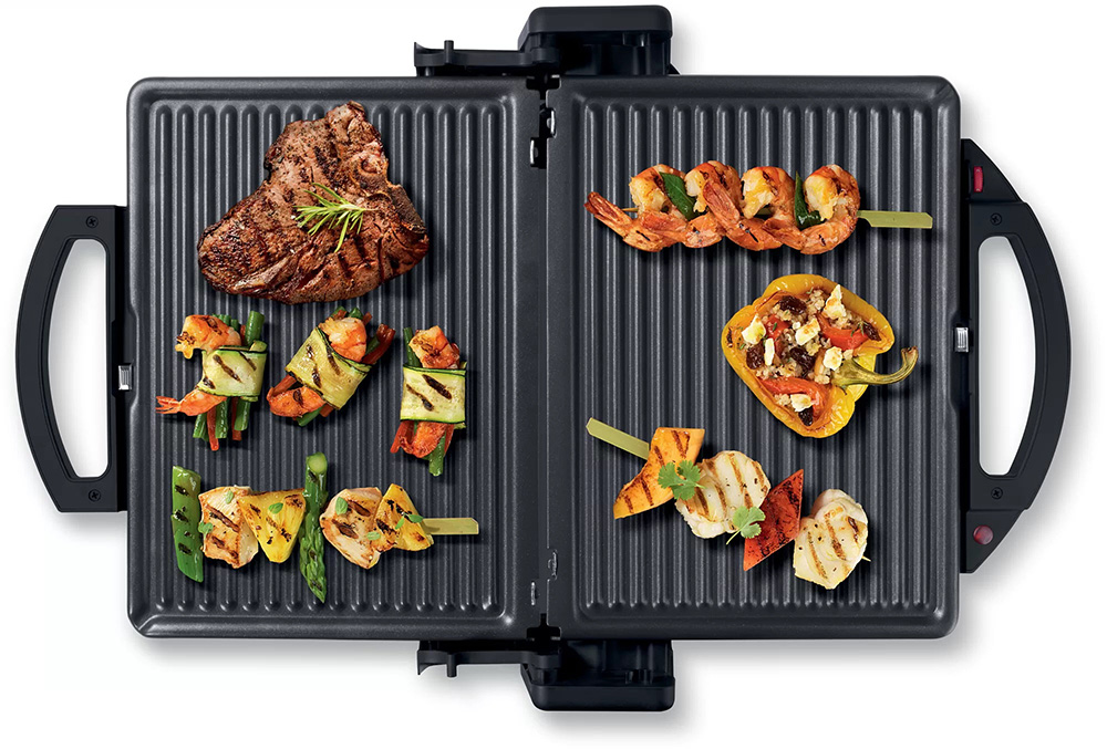 Корисні та смачні страви завдяки трьом позиціям контактного гриля, які відкривають практично безмежні можливості втілення в життя творчих ідей на кухні. Закритий, як контактний гриль, відкритий, як настільний гриль та з режимом "верхнє та нижнє нагрівання" - для смаження, запікання, гратинування або нагрівання. Готуйте соковиті стейки, смачні гамбургери, тости, паніні, бутерброди або фокаччо - насолоджуйтесь тим, що вам подобається. Смачно, низькокалорійно та корисно.