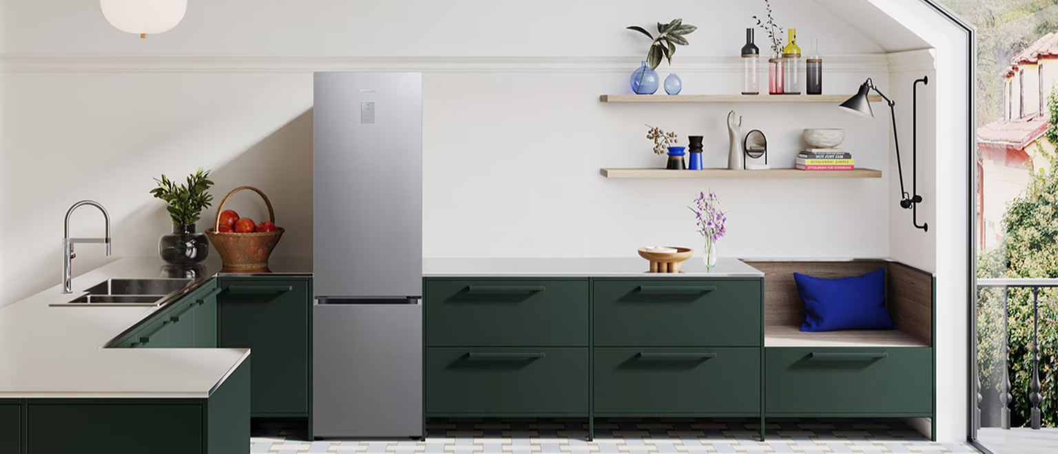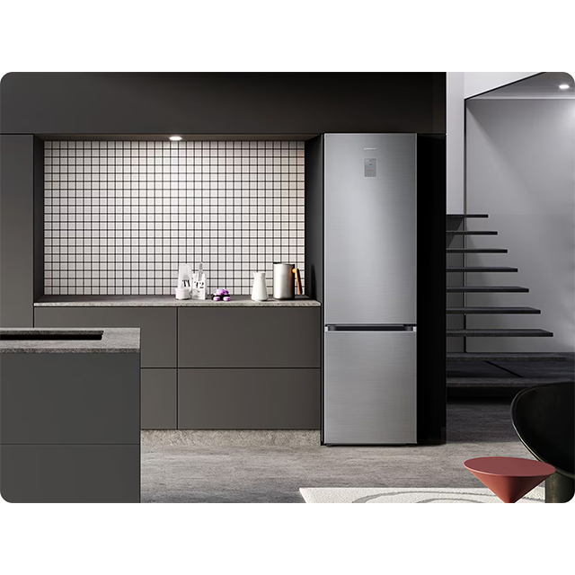 Розмістіть холодильник у зручному для вас місці, не зважаючи на стіни. Конструкція реверсивних дверцят дозволяє відчиняти їх на 90°, не зачіпаючи краєм жодну стіну*. Таким чином, ви можете розмістити холодильник у найзручнішому місці, а дверцята повністю відчинятимуться до рівня бокової стіни.