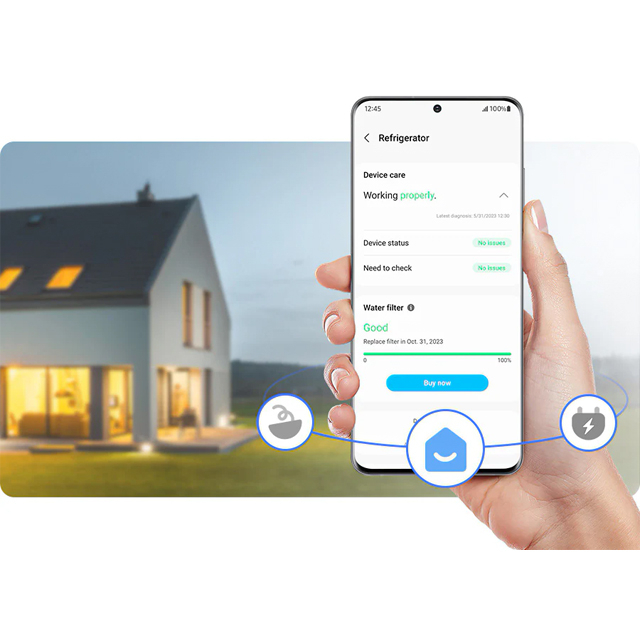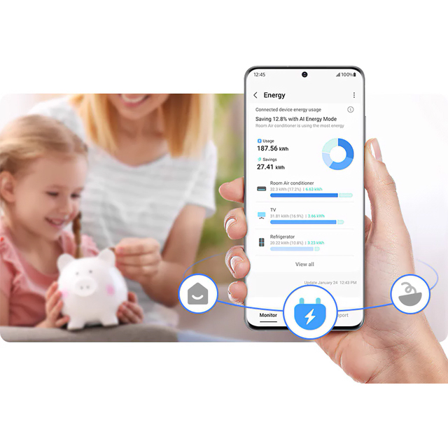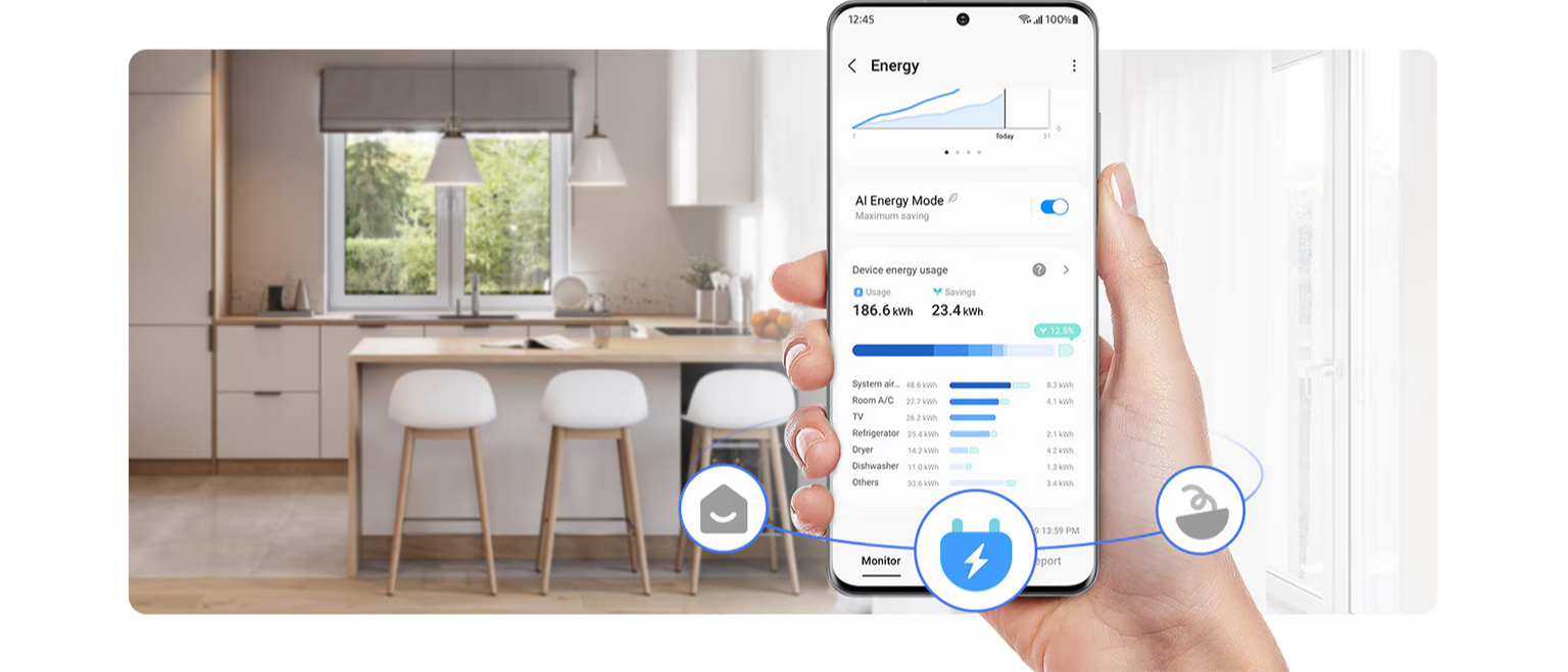 Керуйте споживанням енергії, щоб зменшити викиди вуглецевого газу в атмосферу та заощадити гроші. SmartThings Energy* надає поради щодо енергоефективності, також відстежує енергоспоживання приладів ** у режимі реального часу та порівнює його з попереднім місяцем.Доступно на пристроях Android та iOS. Потрібне з'єднання Wi-Fi та обліковий запис Samsung. ** SmartThings Energy наразі працює приблизно з 40 побутовими приладами Samsung, які підтримують SmartThings. Це холодильники, пральні машини, сушильні машини, посудомийні машини, кондиціонери, очищувачі повітря, пилососи, духовки, витяжки, варильні поверхні, мікрохвильові печі, телевізори (з червня 2022 року) та лічильники електроенергії.