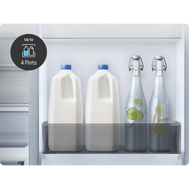 Поліпшене використання простору холодильника з функціональною полицею для напоїв. Продуманий дизайн з широкою виїмкою дозволяє зберігати навіть пляшки з-під шампанського, а плоска форма полиць може бути використана для зберігання інших продуктів, наприклад, коробок для яєць.