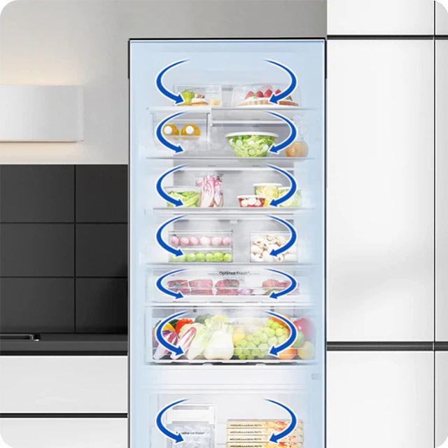 Гарантує, що вся ваша їжа належним чином охолоджена. Система всебічного охолодження рівномірно охолоджує кожне відділення від кута до кута. Вона постійно перевіряє температуру та забезпечує циркуляцію холодного повітря через оптимально розташовані вентиляційні отвори. Завдяки цьому продукти зберігаються при оптимальній температурі та довше залишаються свіжими.