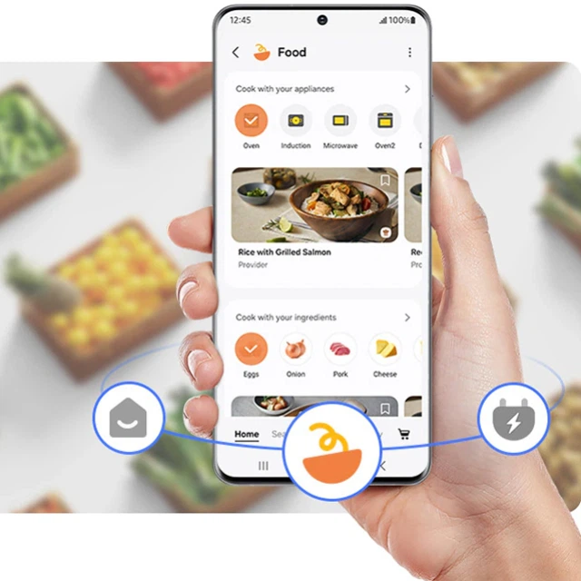 Впорядковуйте, готуйте та купуйте їжу ефективніше. SmartThings Food* дозволяє створювати список продуктів у вашому холодильнику та керувати термінами їхньої придатності, щоб ви могли перевірити, що у вас є. Він також рекомендує персоналізовані рецепти на основі ваших уподобань.