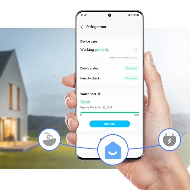 Догляд за холодильником став ще простішим. SmartThings Home Care* забезпечує моніторинг і сповіщення в реальному часі. Ви можете перевірити його стан, включно зі станом фільтра для води. Він також автоматично повідомляє вас, якщо певні деталі потребують заміни або якщо виявлені проблеми.