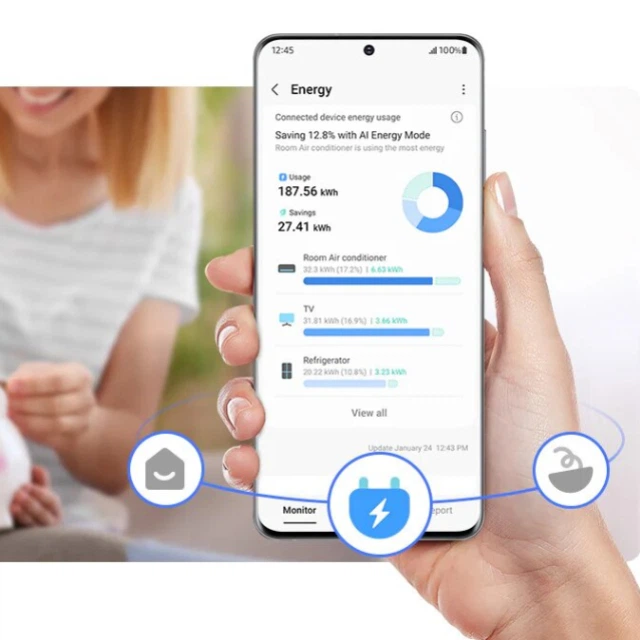 Керуйте споживанням енергії, щоб зменшити викиди вуглецевого газу в атмосферу та заощадити гроші. SmartThings Energy* надає поради щодо енергоефективності. Він також відстежує енергоспоживання приладів** у режимі реального часу та порівнює його з попереднім місяцем.