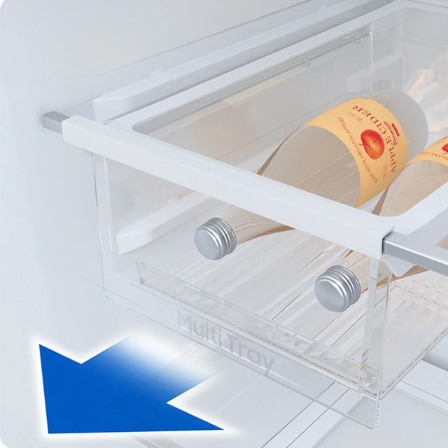 Ефективно використовуйте простір у вашому холодильнику. Знімний мультилоток* добре поміщається під полицями та дозволяє акуратно зберігати та впорядковувати різноманітні дрібні предмети, як-от пляшки та банки, а також їжу та інгредієнти, як-от коробки від піци та лотки для яєць.