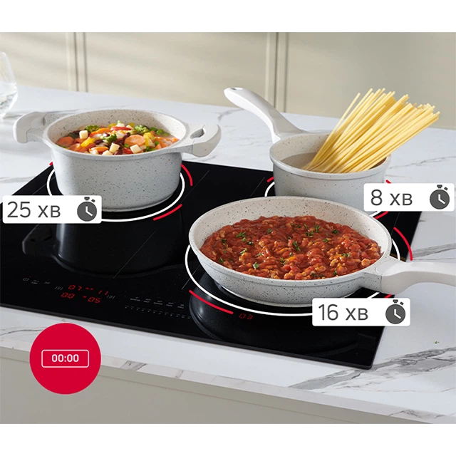 За допомогою вбудованого таймера можна легко контролювати час приготування окремо для кожної зони нагрівання. Коли таймер дораховує до нуля, варильна поверхня автоматично вимикає зону нагрівання з характерним звуковим сигналом. Або, за бажанням, використовуйте таймер як годинник. Індукційна варильна поверхня дасть вам повний контроль над часом, який ви проводите на кухні.
