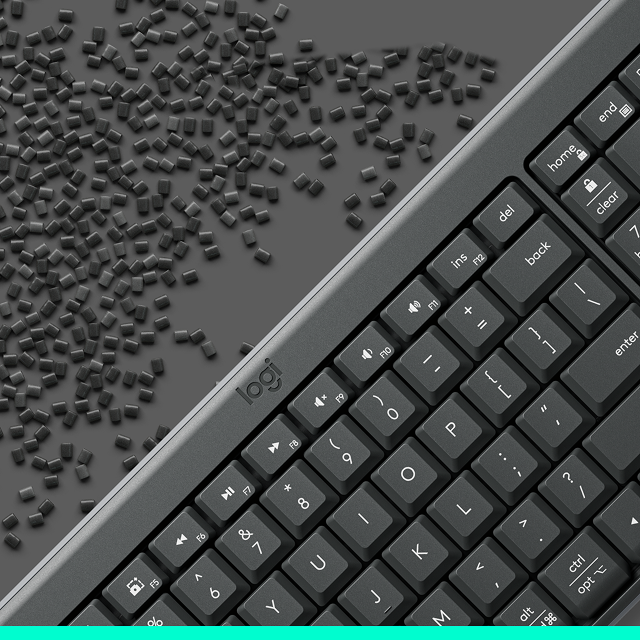 Пластикові деталі клавіатури K250 розроблені для тривалого використання, виготовлені з міцного матеріалу, що містить щонайменше 64% переробленого пластику, щоб витримувати щоденну тривалу роботу.