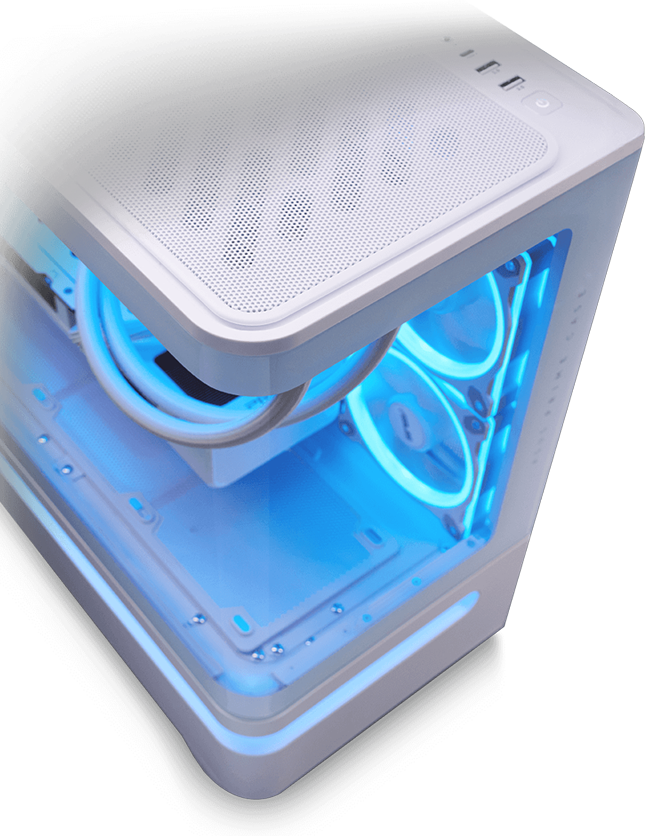 Вигнуте загартоване скло, що охоплює дві сторони корпусу, відкриває вид на компоненти з різних ракурсів. Це скло проходить п’ять стадій обробки, зокрема термічне зміцнення, що відповідає аерокосмічним стандартам і забезпечує виняткову міцність та довговічність. Такий підхід гарантує надійний захист і підвищує якість процесу складання ПК, тож користувачі отримують естетичну й функціональну платформу для створення власної системи.