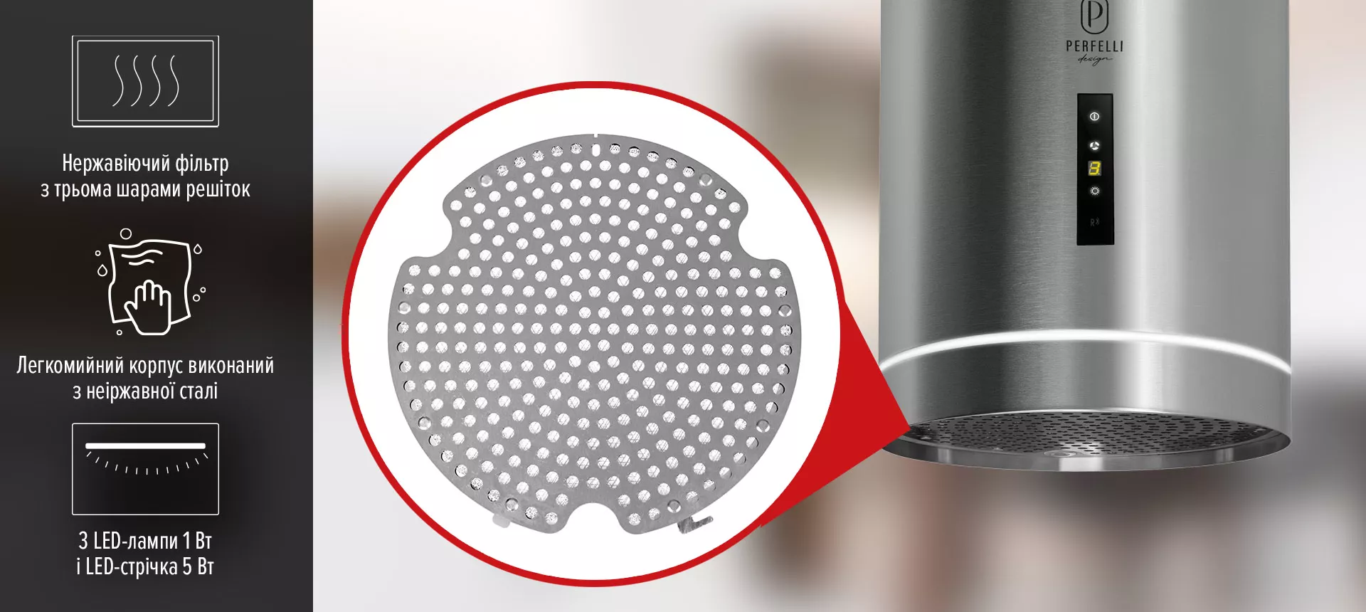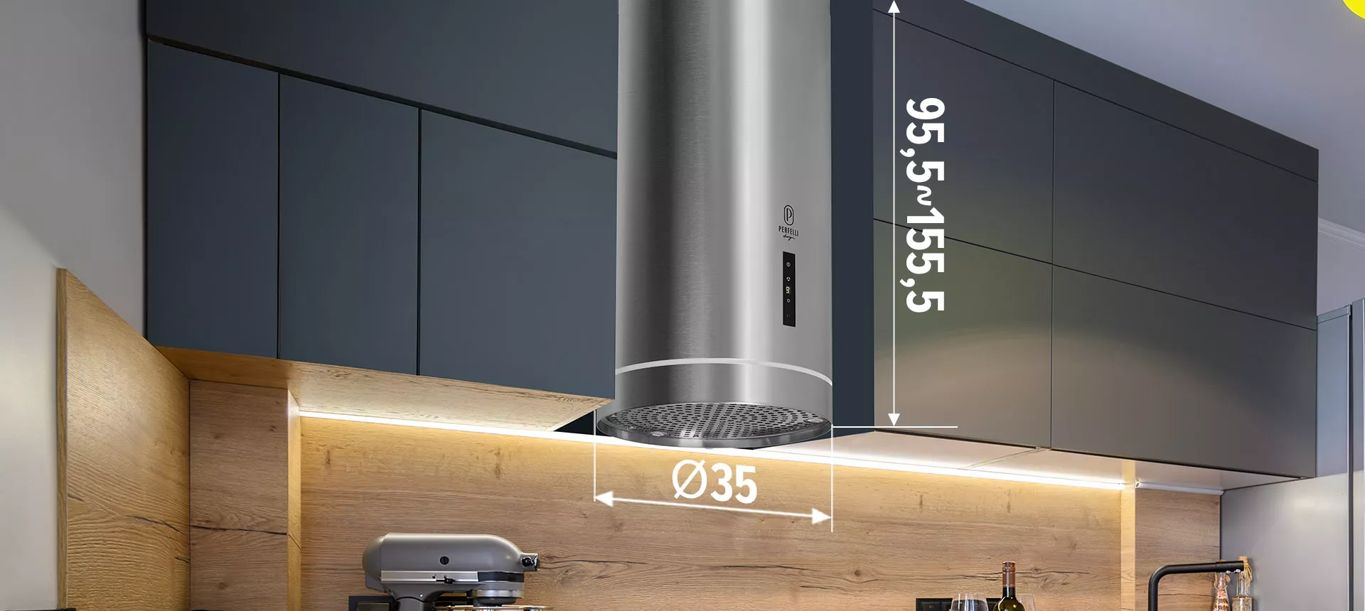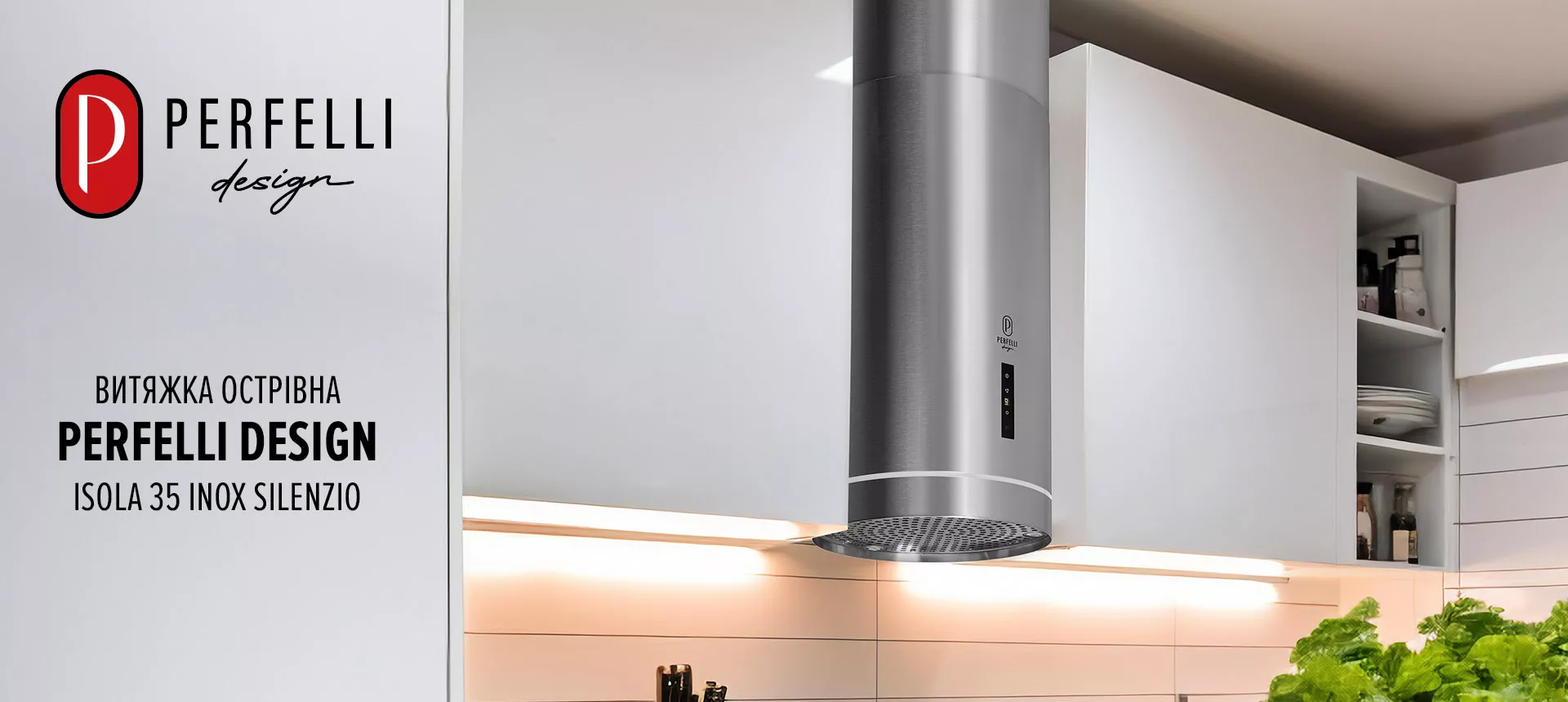 Perfelli DESIGN ISOLA 35 INOX SILENZIO — вибір для тих, хто цінує тишу та потужність. Інноваційний інверторний BLDC-мотор на 1300 м³/год забезпечує безшумну роботу та ефективну очистку повітря. Витончений корпус з нержавіючої сталі та діаметр 350 мм додають мінімалізму вашій кухні. Сенсорне управління, LED-освітлення і дистанційний пульт створюють максимум комфорту.