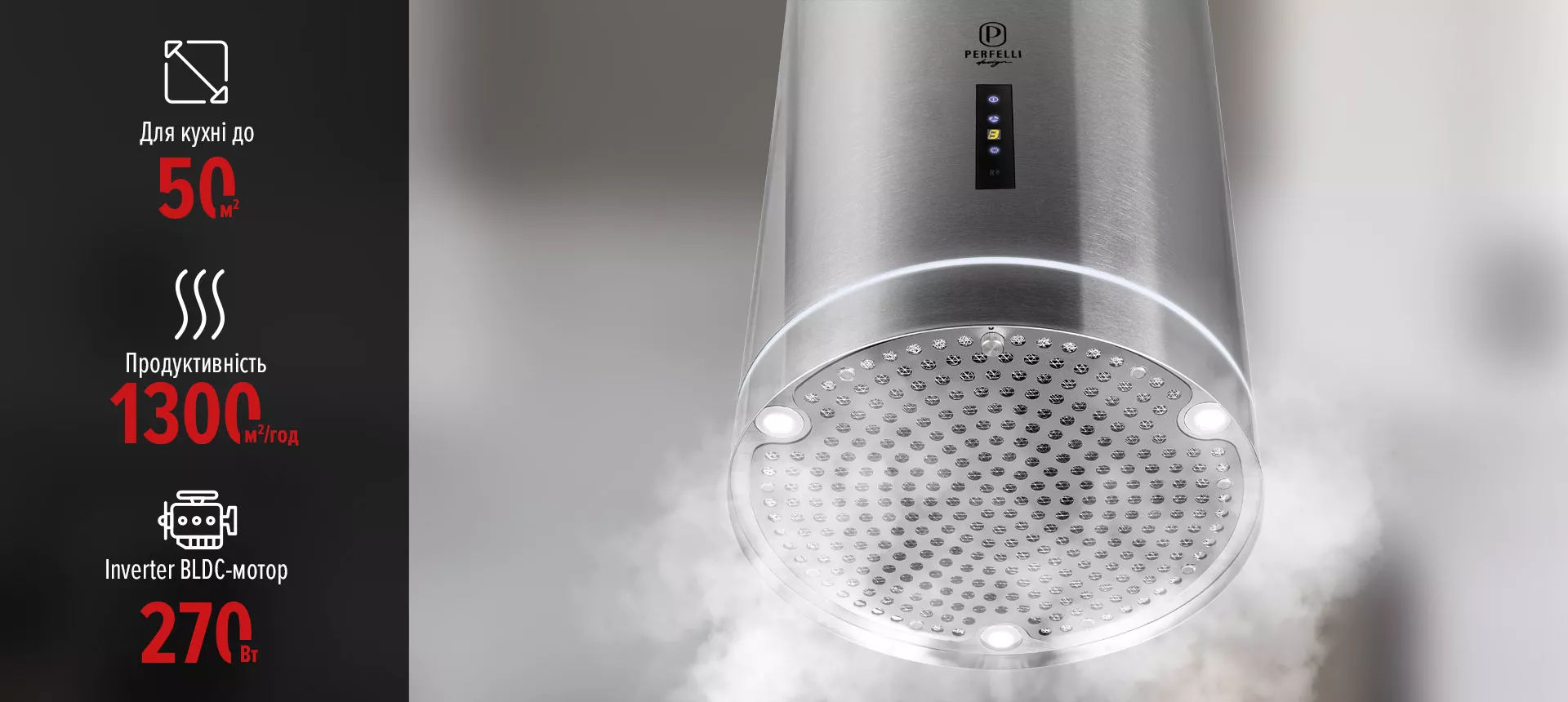 Витяжка острівна PERFELLI DESIGN ISOLA 35 INOX SILENZIO — тиха витяжка з BLDC-мотором 1300 м³/год