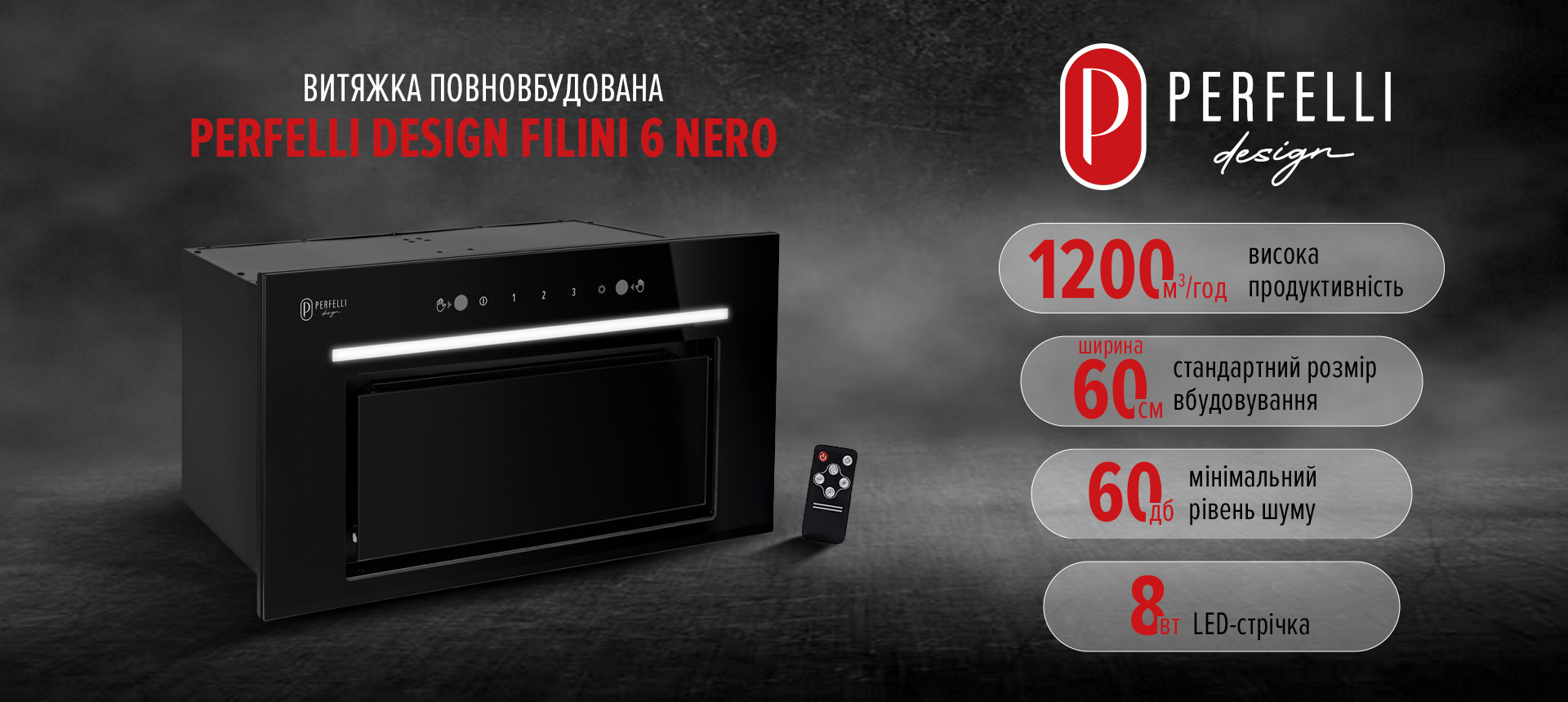 PERFELLI DESIGN FILINI 6 NERO – повновбудована витяжка, що вражає потужністю й елегантністю