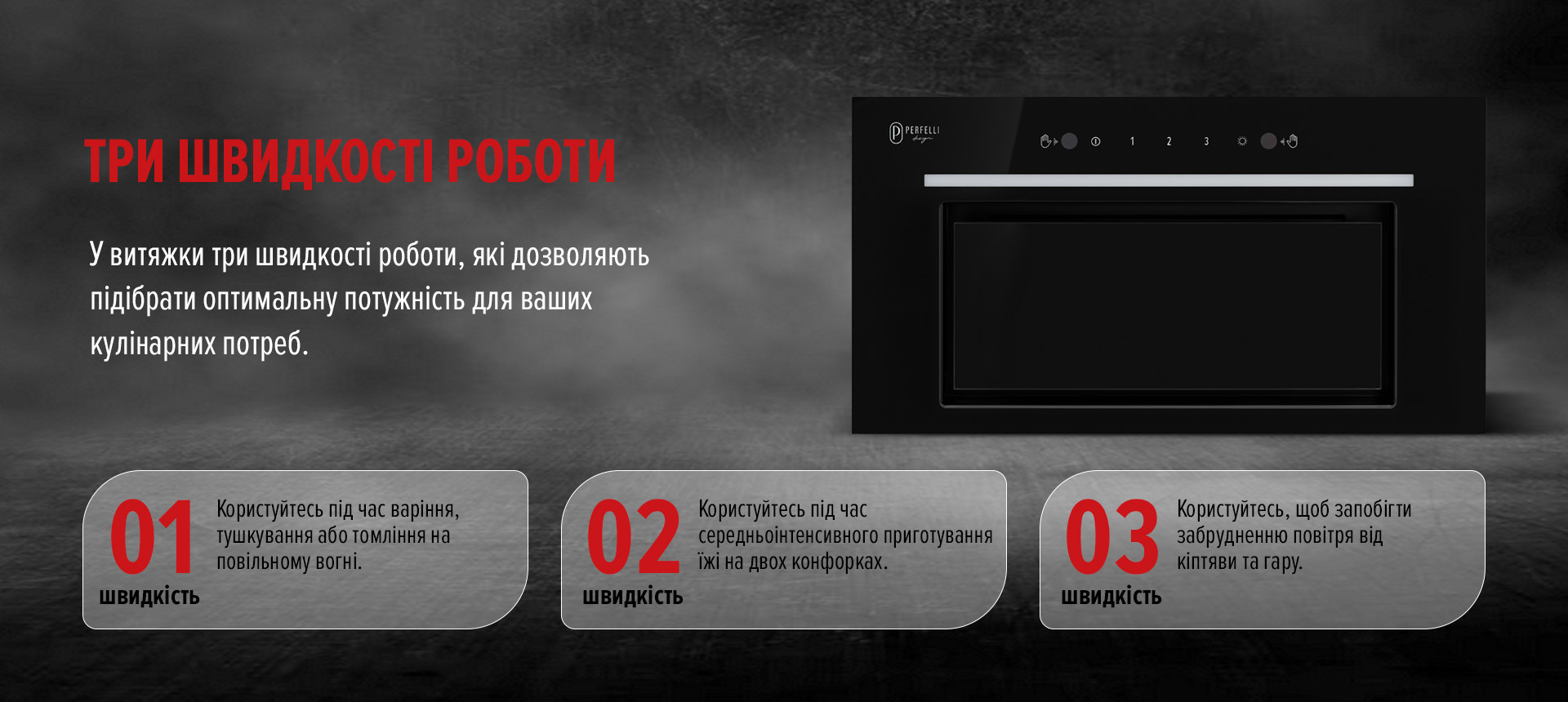 Три рівні швидкості дозволяють знайти необхідний компроміс між ефективністю та комфортом. Такий акустичний діапазон забезпечує зручну експлуатацію незалежно від обставин приготування.
