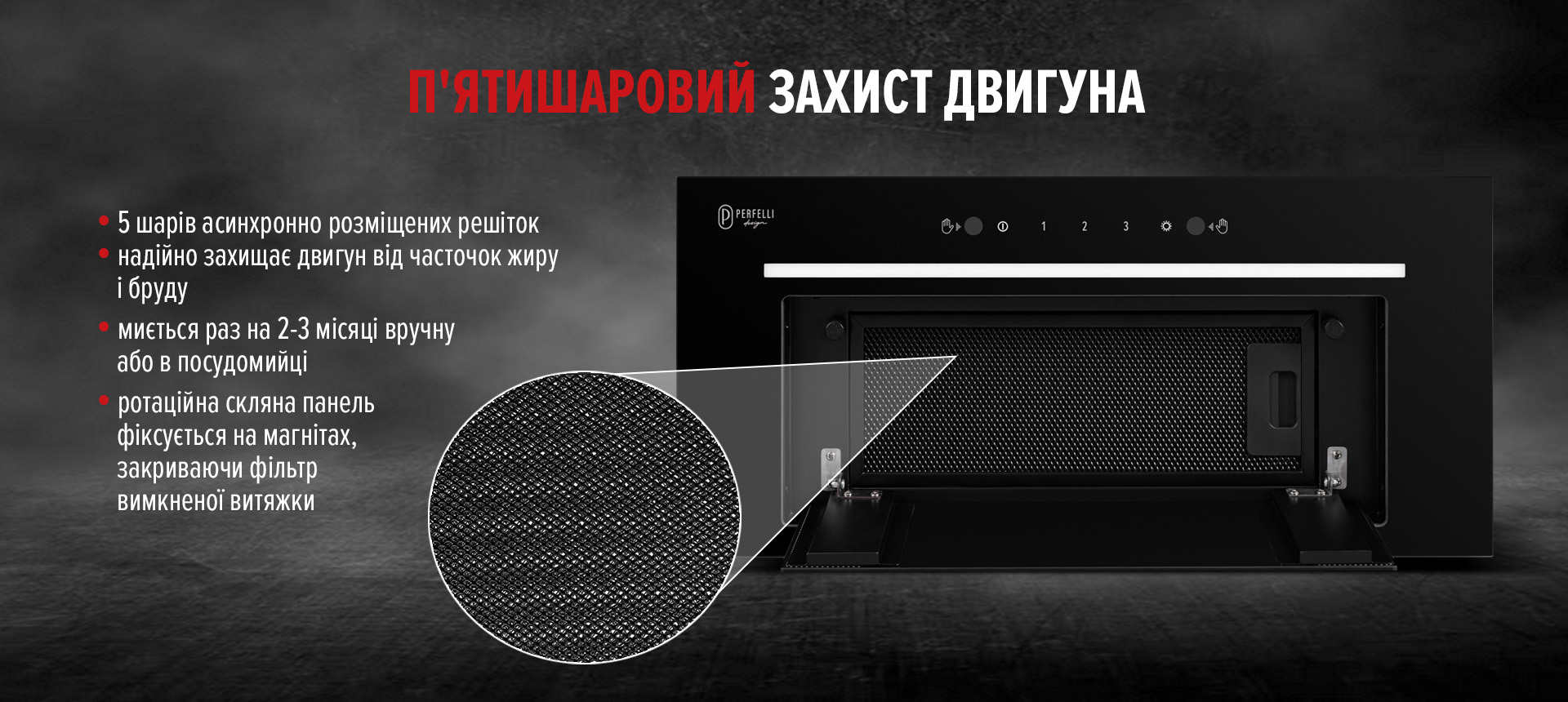 - Чорний п’ятишаровий алюмінієвий фільтр затримує до 99 % жирних частинок, забезпечуючи безпеку двигуна і довговічність пристрою. Конструкція дозволяє легко його знімати та мити вручну або в посудомийній машині, що подовжує термін служби витяжки.