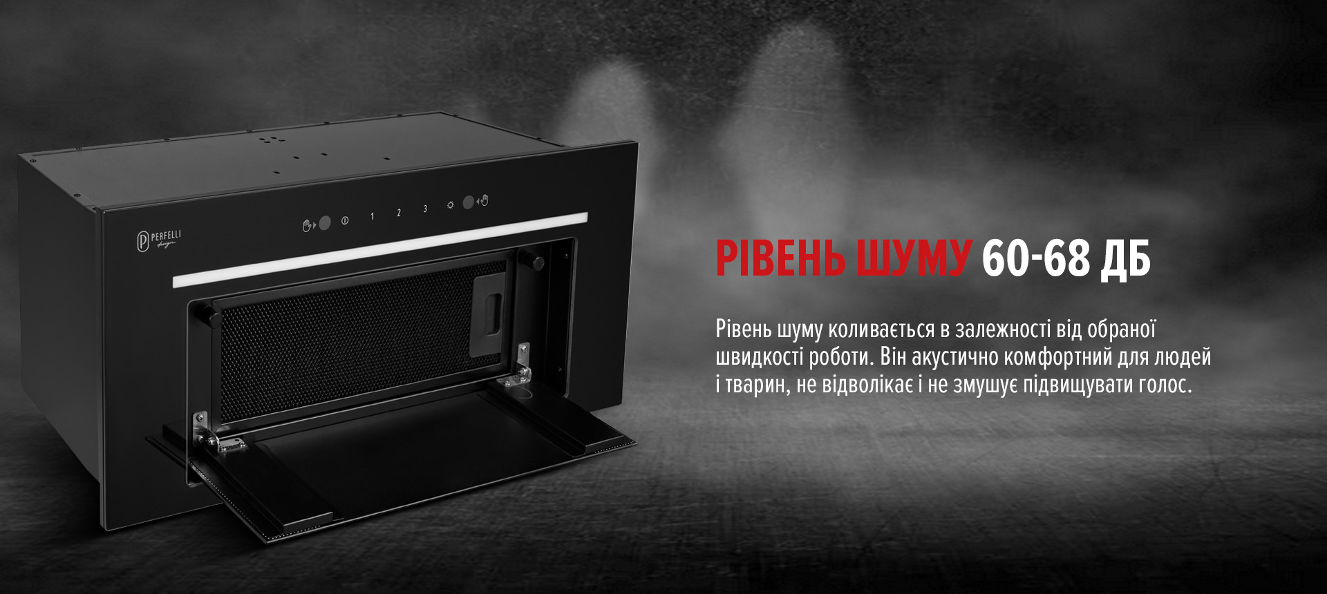 На мінімальному режимі витяжка працює з комфортним рівнем шуму 60 дБ, який не заважає розмовам. У максимальному режимі шум досягає 68 дБ і забезпечує високу продуктивність при швидкісному видаленні забруднень і запахів.