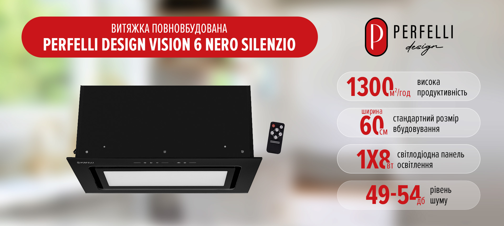 Основні характеристики повновбудованої витяжки для кухні PERFELLI DESIGN VISION 6 NERO SILENZIO: