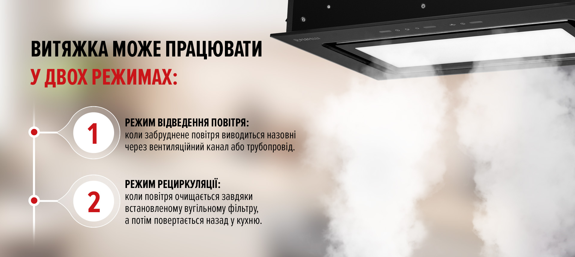 - Режим рециркуляції: коли повітря очищається завдяки встановленому вугільному фільтру, а потім повертається назад у кухню.