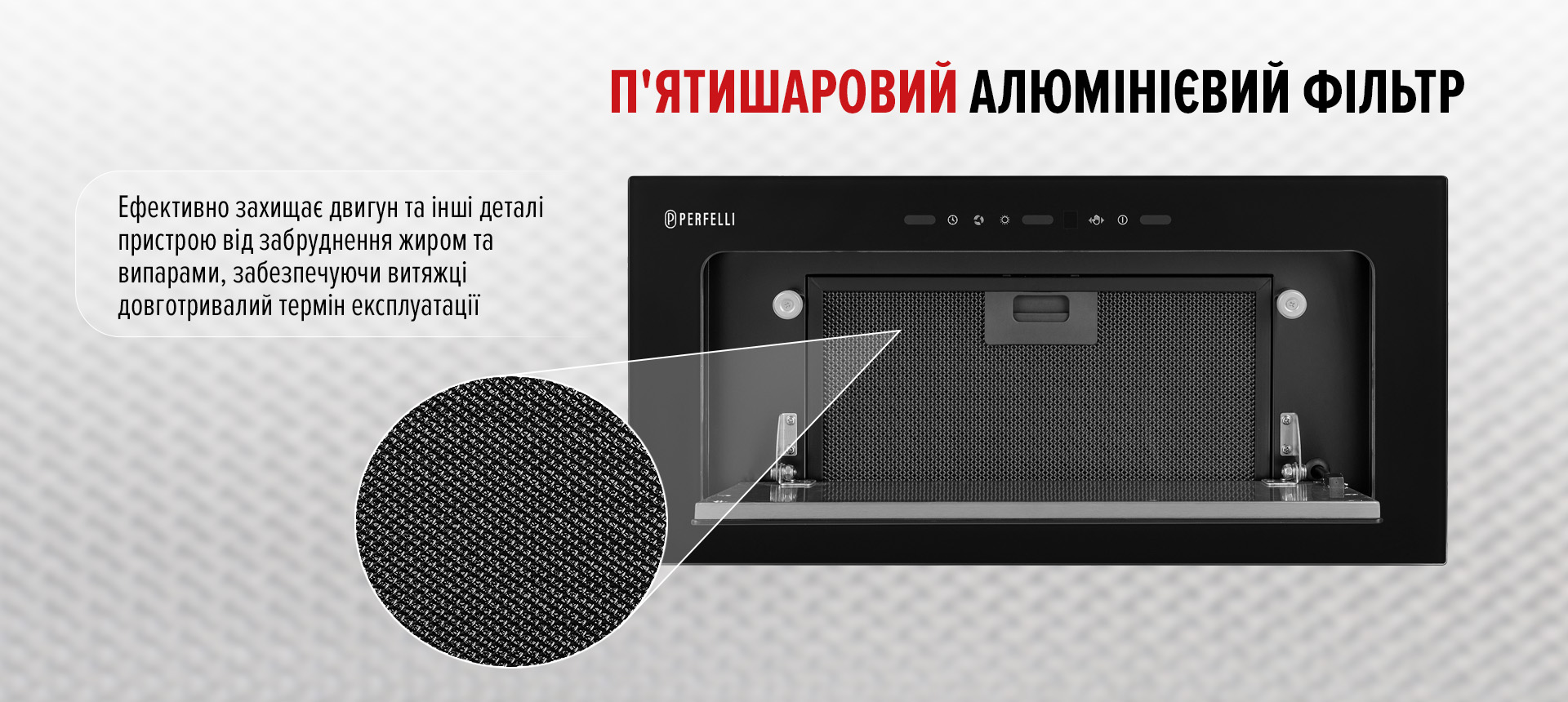 Витяжка оснащена п'ятишаровим алюмінієвим фільтром, який ефективно захищає двигун та інші деталі пристрою від забруднення жиром та випарами, забезпечуючи витяжці довготривалий термін експлуатації. Фільтр легко знімається та миється, що робить процес обслуговування максимально зручним. Рекомендується регулярно перевіряти та чистити фільтр (в залежності від інтенсивності використання приладу), щоб підтримувати оптимальну продуктивність витяжки.