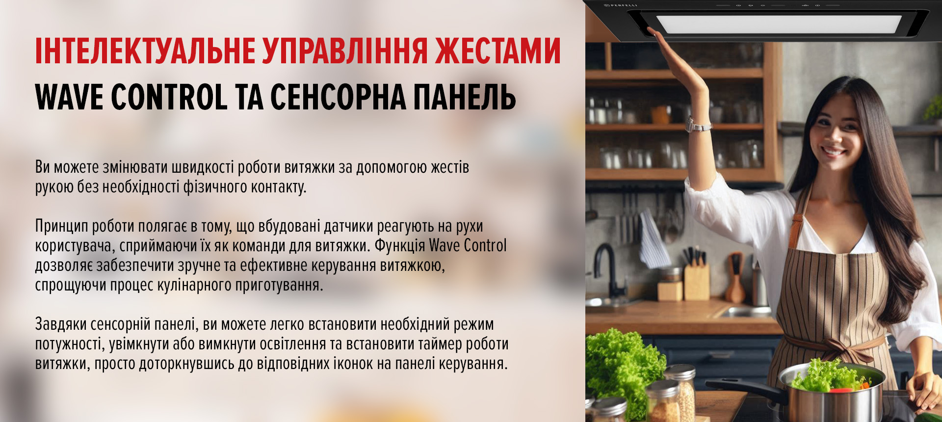 Вбудовані датчики в технології Wave Control реагують на ваші рухи, перетворюючи їх на команди для витяжки. Це дозволяє змінювати режими роботи без дотику, що особливо зручно у разі, якщо у вас забруднені руки. Сенсорна панель доповнює цю функцію, надаючи швидкий доступ до налаштувань потужності, освітлення та таймера.
