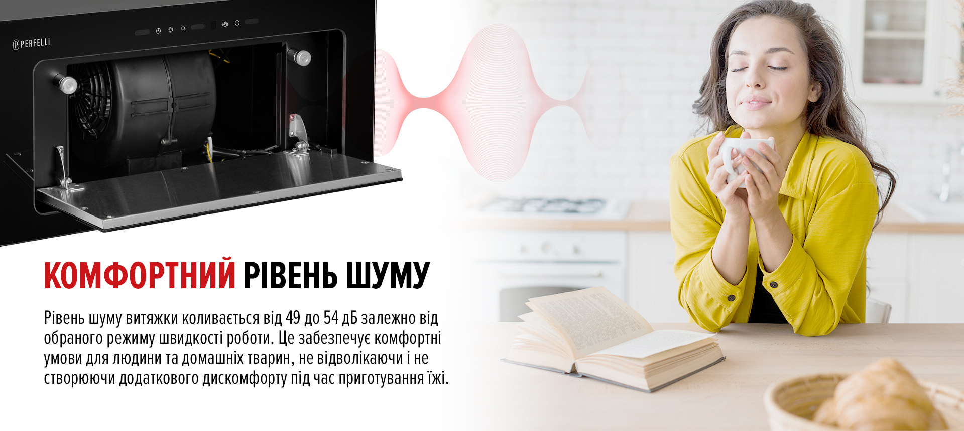 Рівень шуму витяжки коливається від 49 до 54 дБ залежно від обраного режиму швидкості роботи. Це забезпечує комфортні умови для людини та домашніх тварин, не відволікаючи і не створюючи додаткового дискомфорту під час приготування їжі.