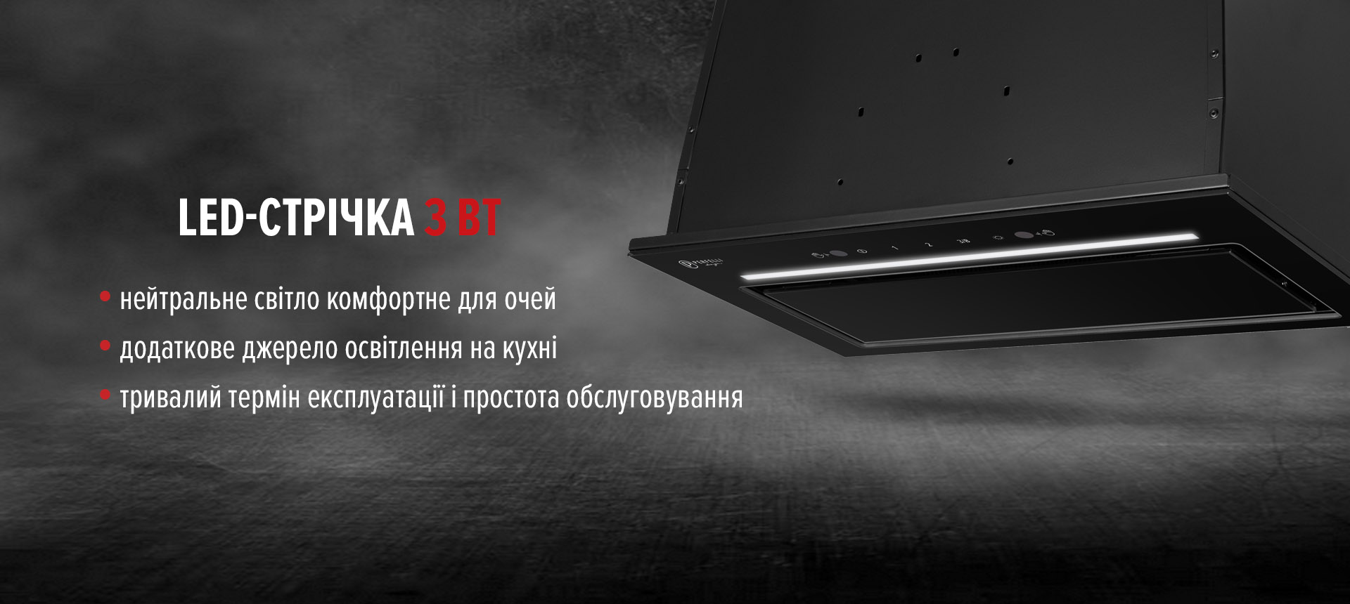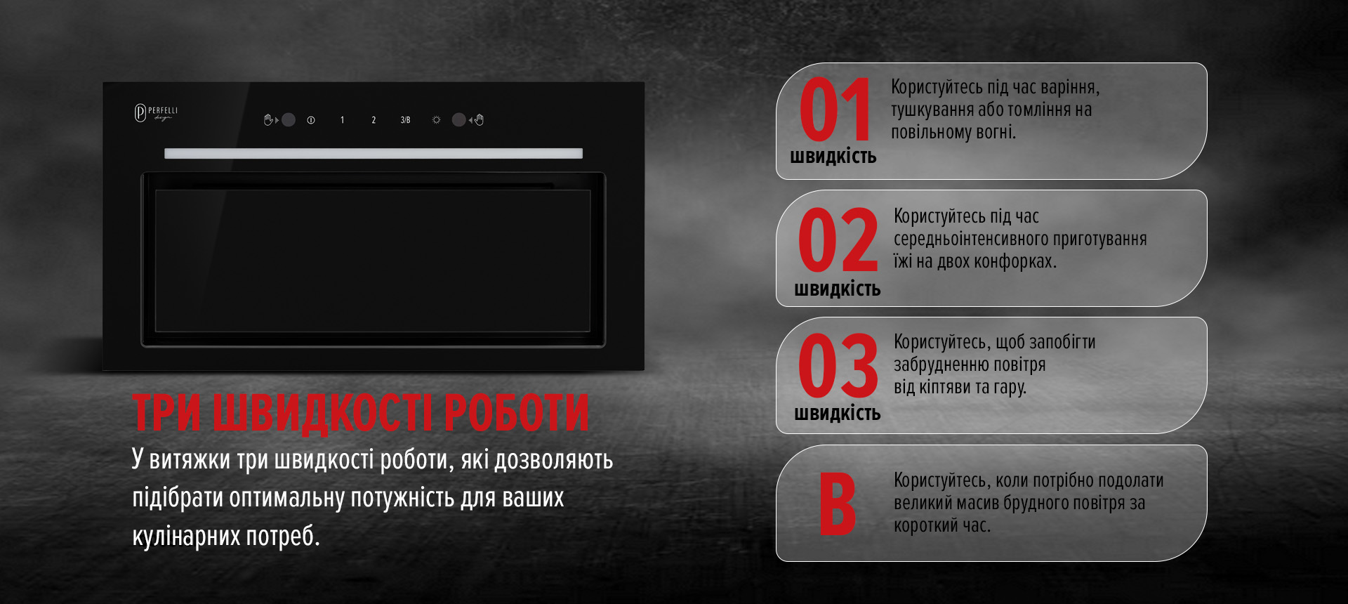 BLDC-мотор нового покоління забезпечує високу ефективність при низькому енергоспоживанні. Завдяки бустерному режиму витяжка швидко справляється з парою, запахами та жиром навіть під час інтенсивного смаження.