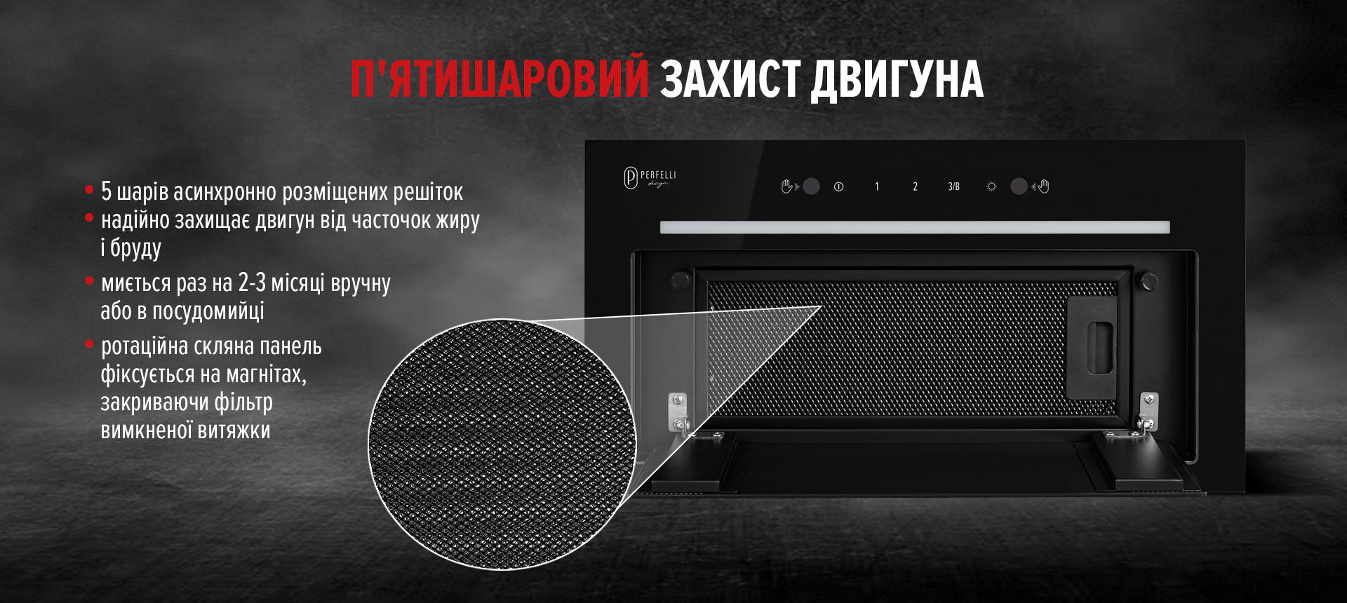 - П’ятишаровий алюмінієвий фільтр чорного кольору з класом ефективності E. Він розміщений під міцною скляною панеллю, яка фіксується магнітами. Це дозволяє легко очищати фільтр і зберігати бездоганний вигляд витяжки.