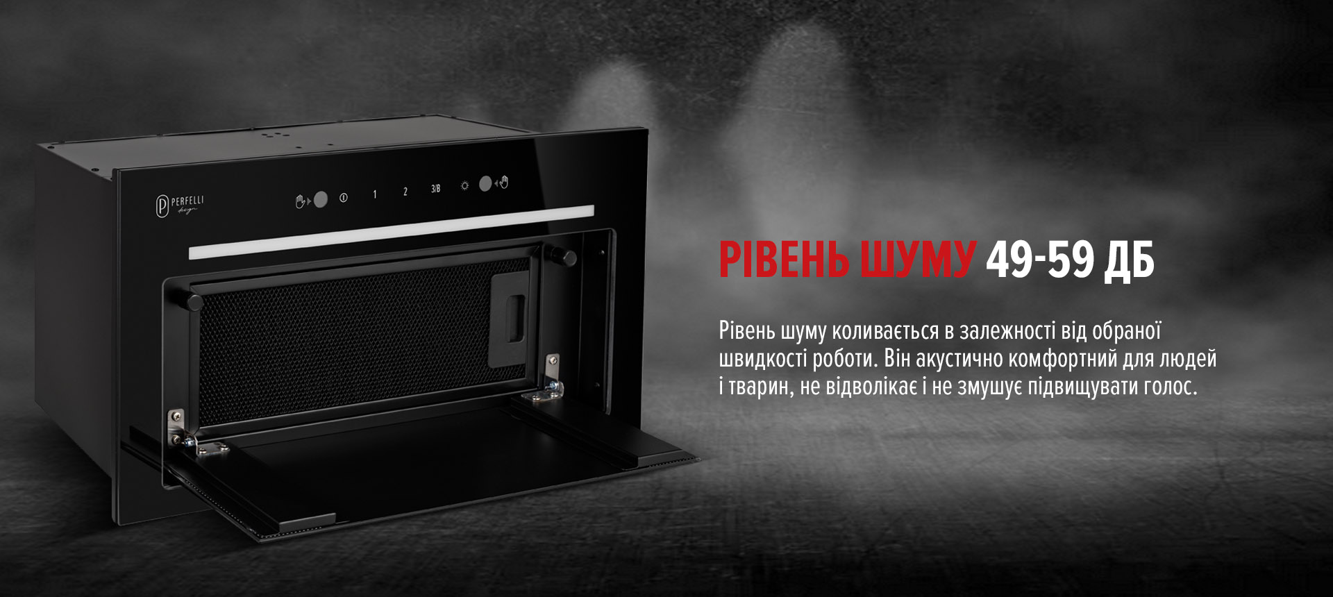 49–59 дБ — це рівень шуму, близький до фонових звуків вдома. Це означає, що витяжка працює майже непомітно, не створюючи дискомфорту. Такий рівень шуму зазвичай не викликає акустичної втоми навіть при тривалому приготуванні.
