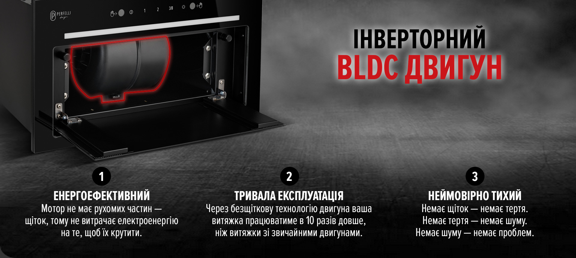 Витяжка обладнана сучасним BLDC-мотором (безщітковим двигуном постійного струму), який вирізняється надзвичайно тихою та стабільною роботою. Завдяки відсутності щіток, мотор практично не зношується і працює без втрати ефективності роками. У порівнянні з класичними щітковими моторами, BLDC забезпечує на 30–40% менше енергоспоживання та набагато нижчий рівень шуму — усього 49–59 дБ. Такий двигун не перегрівається навіть при тривалій роботі й здатний автоматично адаптувати оберти до обраного режиму. Його конструкція також забезпечує вищу потужність на низьких обертах, що особливо зручно для вечірнього використання. Завдяки мінімальним втратам енергії на тертя, BLDC-мотори мають величезний ресурс щоденної експлуатації.