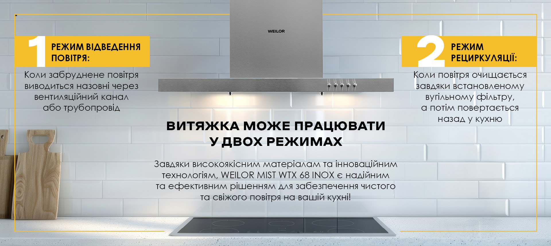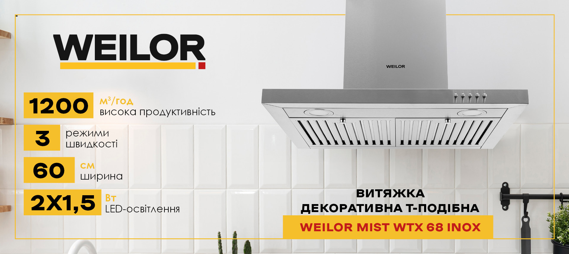 Т-подібна форма витяжки над плитою доповнить будь-який інтер'єр і стане головною прикрасою кухні. Даний тип настінних кухонних витяжок WEILOR відрізняється високою надійністю і стильними дизайнерськими рішеннями. Нержавіюча сталь у дизайні WEILOR MIST WTX 68 INOX додасть елегантності і строгості Вашому інтер'єру. Кухонна техніка з нержавіючої сталі - це та деталь, яка зробить інтер'єр більш сучасним і стильним.