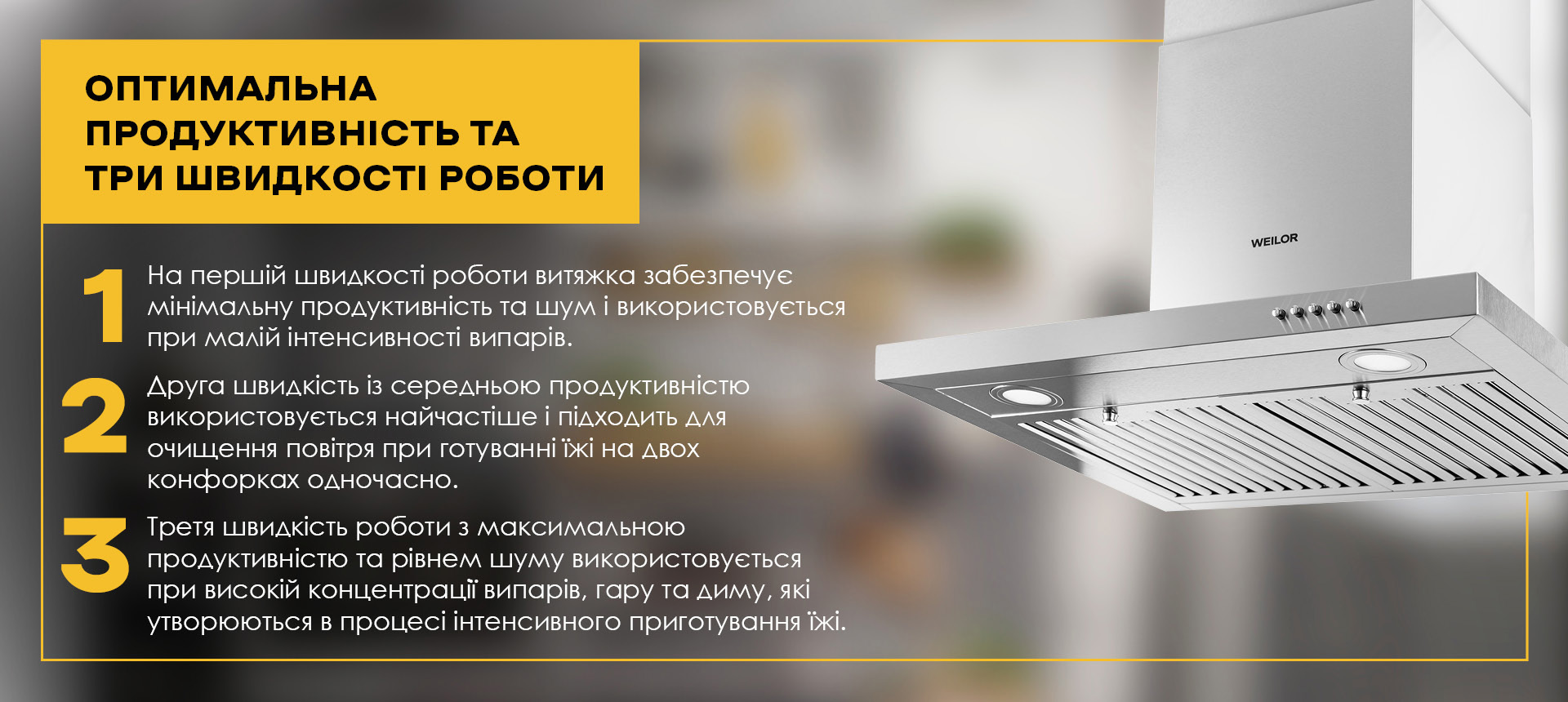 Витяжка кухонна WEILOR MIST WTX 68 INOX працює на трьох різних швидкостях, що дозволяє господині обирати потрібну інтенсивність очищення повітря, в залежності від його забрудненості.