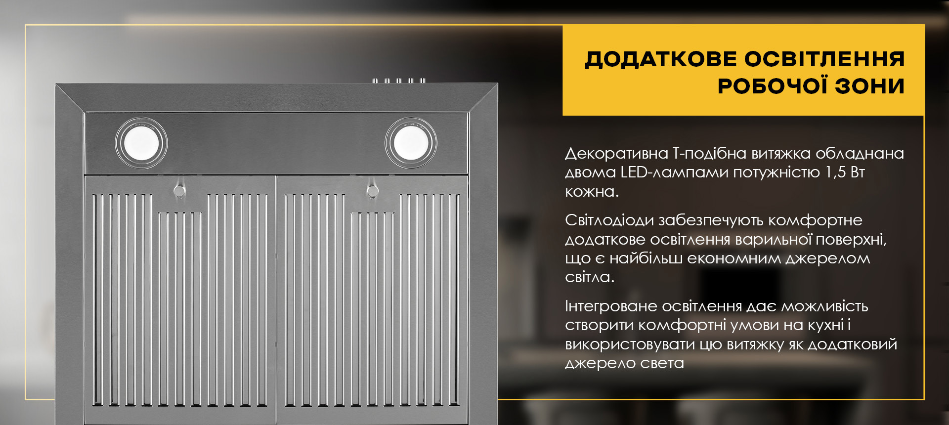Сучасне освітлення представлене двома LED-лампами потужністю 1,5 Вт кожна. Яскраве LED-освітлення забезпечує додаткове підсвічування робочої зони, роблячи процес приготування їжі ще більш комфортним. Робочий ресурс світлодіодів в рази більший, ніж у звичайних ламп, а споживання енергії є мінімальним. Окрім того, світлодіоди досить витривалі при активній експлуатації.