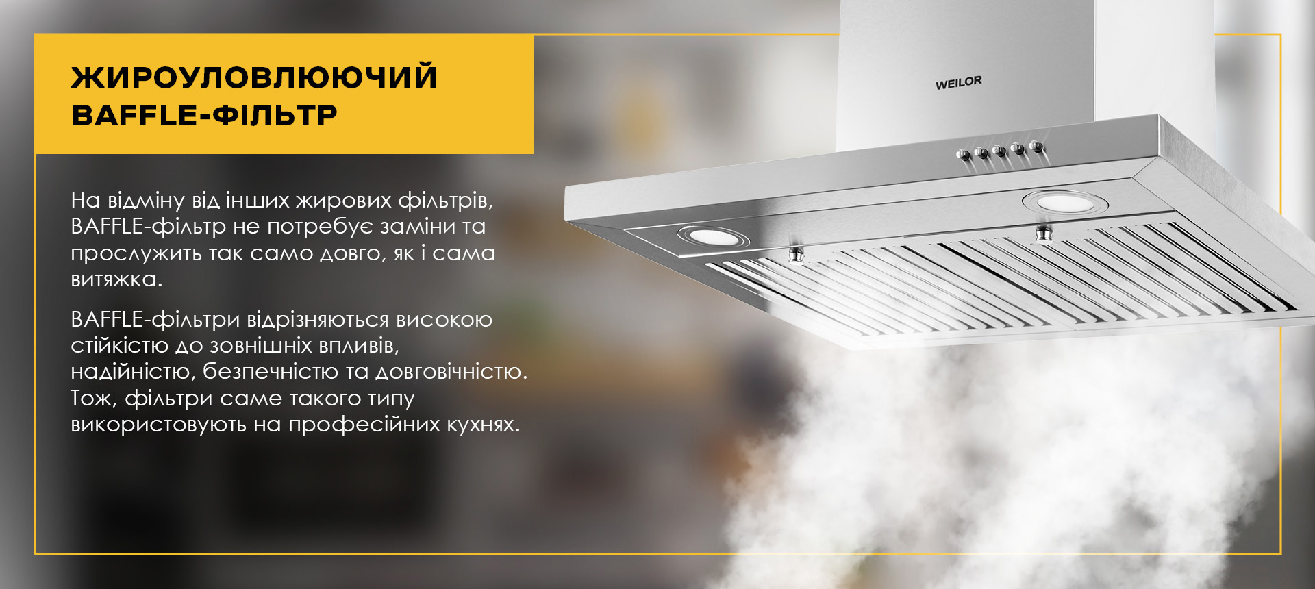 Особливість моделі WEILOR MIST WTX 68 INOX полягає в тому, що ця кухонна витяжка обладнана жировими фільтрами Baffle, які розташовані на нижній частині корпусу, безпосередньо над варильною поверхнею. Як і вся конструкція витяжки Baffle фільтри, виготовлені з нержавіючої сталі, працюють, змушуючи насичене жиром повітря швидко і неодноразово змінювати напрямок, коли воно піднімається через фільтр, краплі жиру конденсуються в металевій лопасті, а потім зливаються в лоток фільтра.