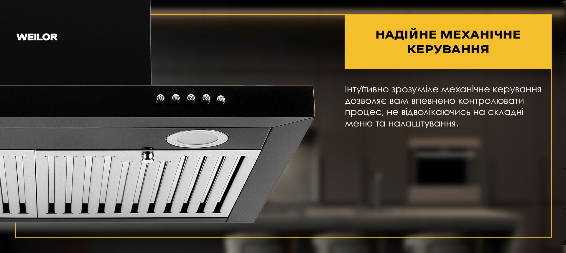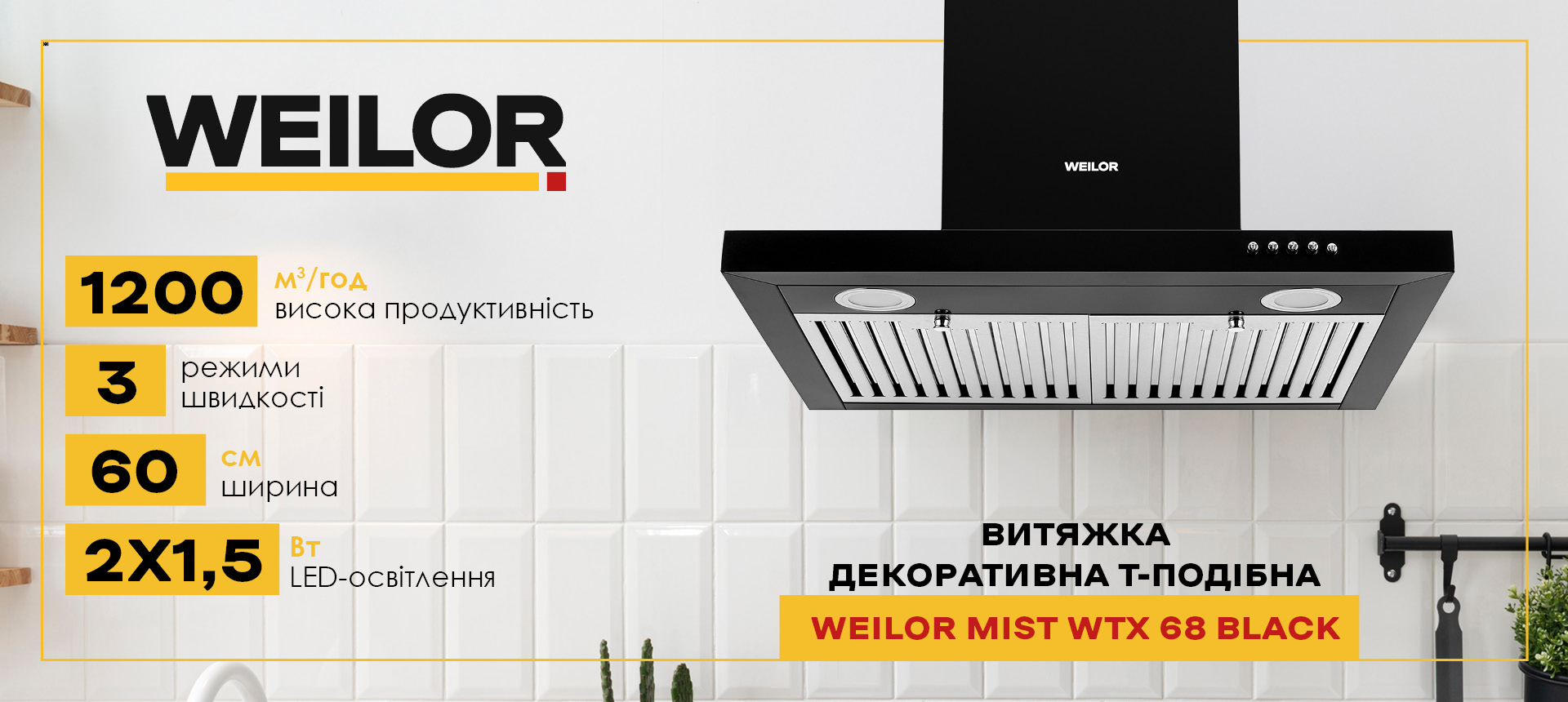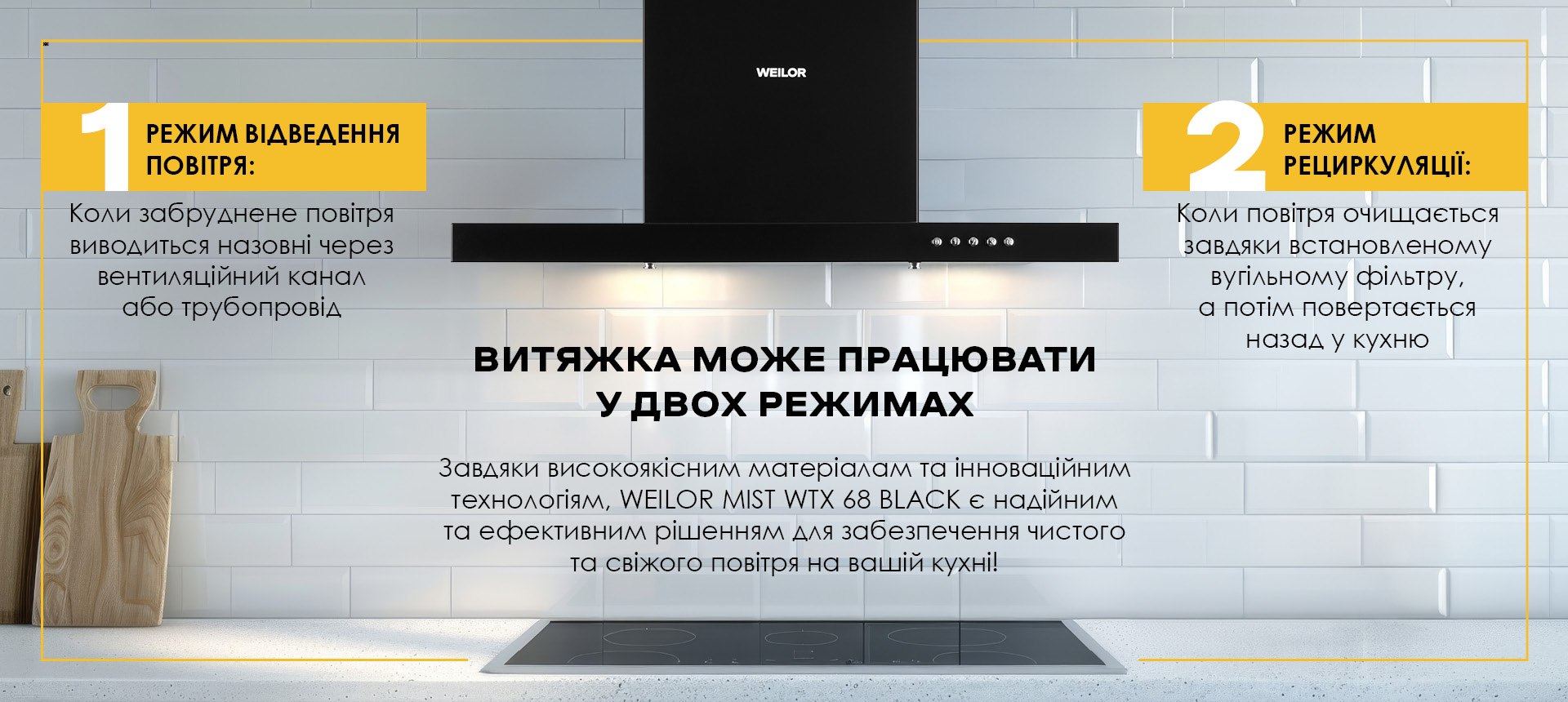 Т-подібна форма витяжки над плитою доповнить будь-який інтер'єр і стане головною прикрасою кухні. Даний тип настінних кухонних витяжок WEILOR відрізняється високою надійністю і стильними дизайнерськими рішеннями. Чорний колір WEILOR MIST WTX 68 BLACK додасть елегантності і строгості, витонченості і розкоші Вашому інтер'єру. Кухонна техніка чорного кольору - це та деталь, яка зробить інтер'єр більш сучасним і стильним.