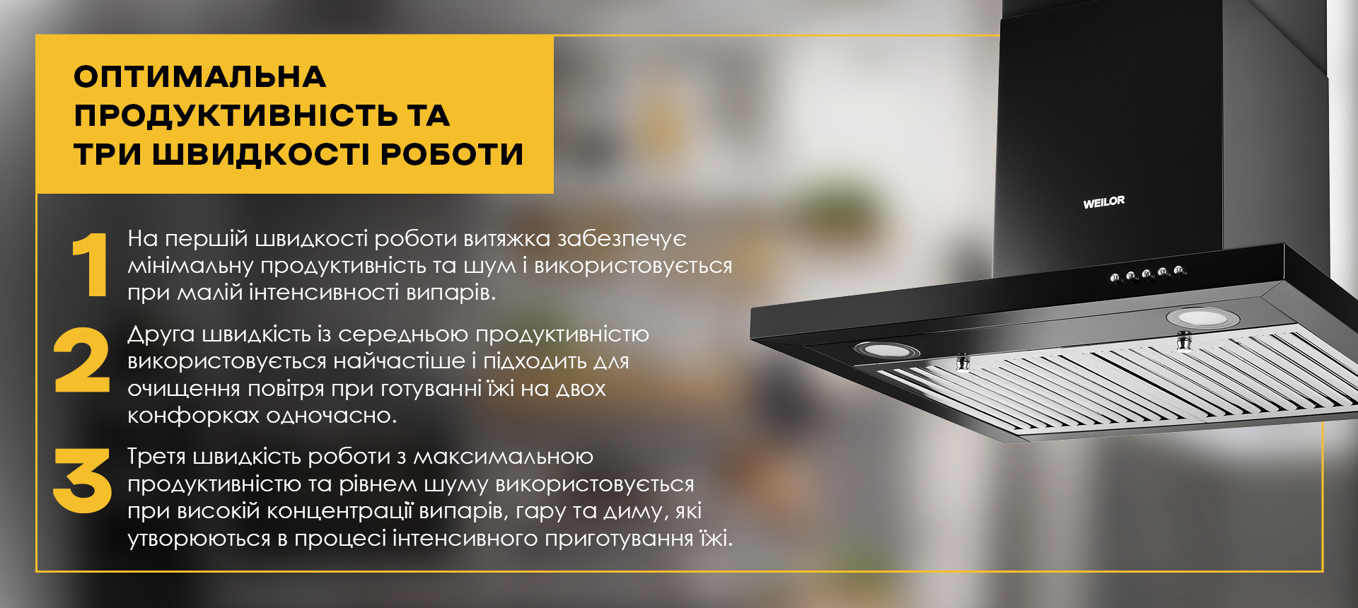 Витяжка кухонна WEILOR MIST WTX 68 BLACK працює на трьох різних швидкостях, що дозволяє господині обирати потрібну інтенсивність очищення повітря, в залежності від його забрудненості.