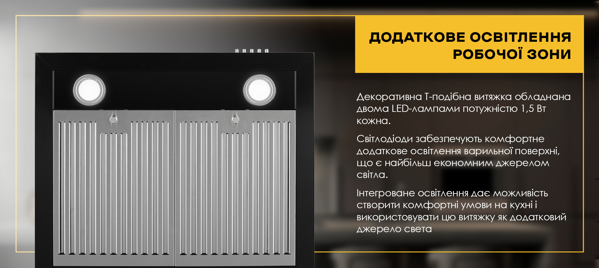 Сучасне освітлення представлене двома LED-лампами потужністю 1,5 Вт кожна. Яскраве LED-освітлення забезпечує додаткове підсвічування робочої зони, роблячи процес приготування їжі ще більш комфортним. Робочий ресурс світлодіодів в рази більший, ніж у звичайних ламп, а споживання енергії є мінімальним. Окрім того, світлодіоди досить витривалі при активній експлуатації.