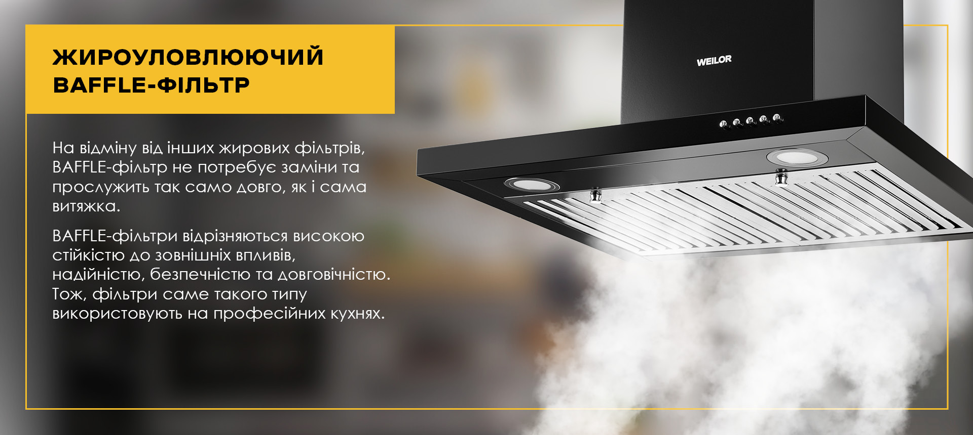 Особливість моделі WEILOR MIST WTX 68 BLACK полягає в тому, що ця кухонна витяжка обладнана жировими фільтрами Baffle, які розташовані на нижній частині корпусу, безпосередньо над варильною поверхнею. Baffle фільтри, виготовлені з нержавіючої сталі, працюють, змушуючи насичене жиром повітря швидко і неодноразово змінювати напрямок, коли воно піднімається через фільтр, краплі жиру конденсуються в металевій лопасті, а потім зливаються в лоток фільтра.