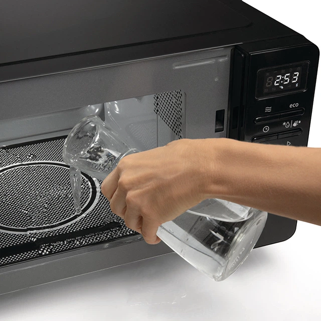 Просто наповніть посуд, придатний для використання в мікрохвильовій печі, водою, поставте його всередину та активуйте програму AquaClean. Утворена пара пом’якшить бруд на стінках камери. Після закінчення програми витріть внутрішню поверхню пічки вологою ганчіркою.