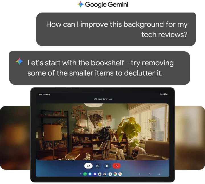 Використовуйте камеру Galaxy Tab A11+ для спілкування з помічником Gemini та отримуйте поради в реальному часі. Просто утримуйте бічну кнопку, щоб розпочати розмову та поділитися зображенням або екраном — Gemini підкаже потрібні рішення та відповіді.