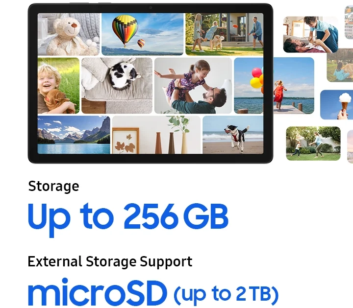 Galaxy Tab A11+ пропонує просторе сховище і високу швидкість роботи. Конфігурації до 8 ГБ ОЗУ і до 256 ГБ вбудованої пам'яті забезпечують плавну багатозадачність і місце для фільмів, ігор і документів. При необхідності обсяг можна розширити до 2 ТБ за допомогою карти microSD.