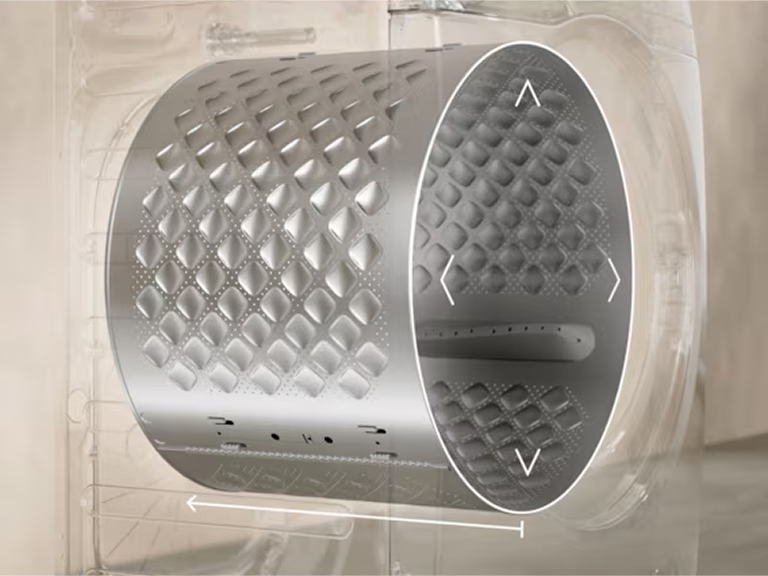 CareDrum XL забезпечує місце для великих завантажень у машині стандартного розміру. Одяг рухається плавно завдяки піднесеному барабану у формі подушки та підйомної лопаті. Завдяки унікальному малюнку барабана він дбайливо ставиться до вашого одягу.