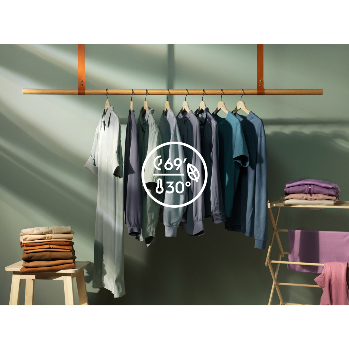 Насолоджуйтеся відчуттям щойно випраного одягу, використовуючи лише частину води. Обробляючи парою, ви можете нейтралізувати запахи* та зменшити кількість складок всього за 25 хвилин. Для ще більшої свіжості додайте наш ароматизатор до програми обробки парою.