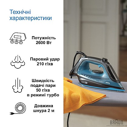 Braun TexStyle 5 пропонує 2600 Вт чудової продуктивності та швидкого нагрівання праски всього за 30 секунд. Разом із безперервною подачею пари (до 50 г/хв) і потужним паровим ударом (до 210 г/хв) праска забезпечує швидкі результати прасування навіть у вертикальному положенні.