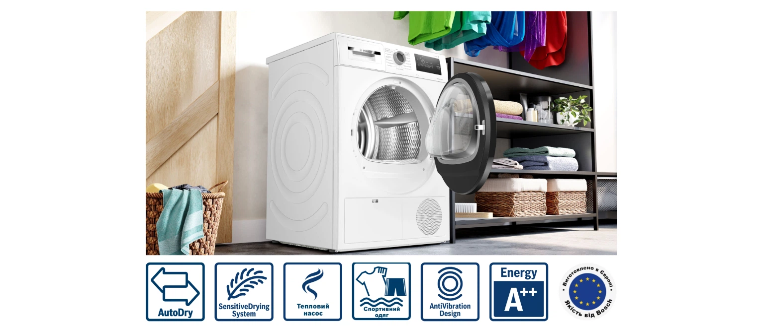 Просто завантажте до 8 кілограмів білизни в машину, а технологія AutoDry висушить речі до вибраного вами ступеня, залишаючи їх трохи вологими для прасування або ж, навпаки, ідеально сухими, щоб їх можна було відразу скласти в шафу. Сенсори постійно вимірюють температуру та вологість, тому тканина не постраждає від нагрівання та надмірного сушіння. Бездоганний результат щоразу!