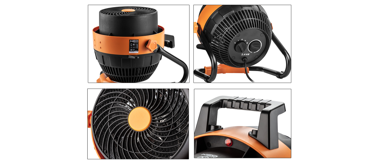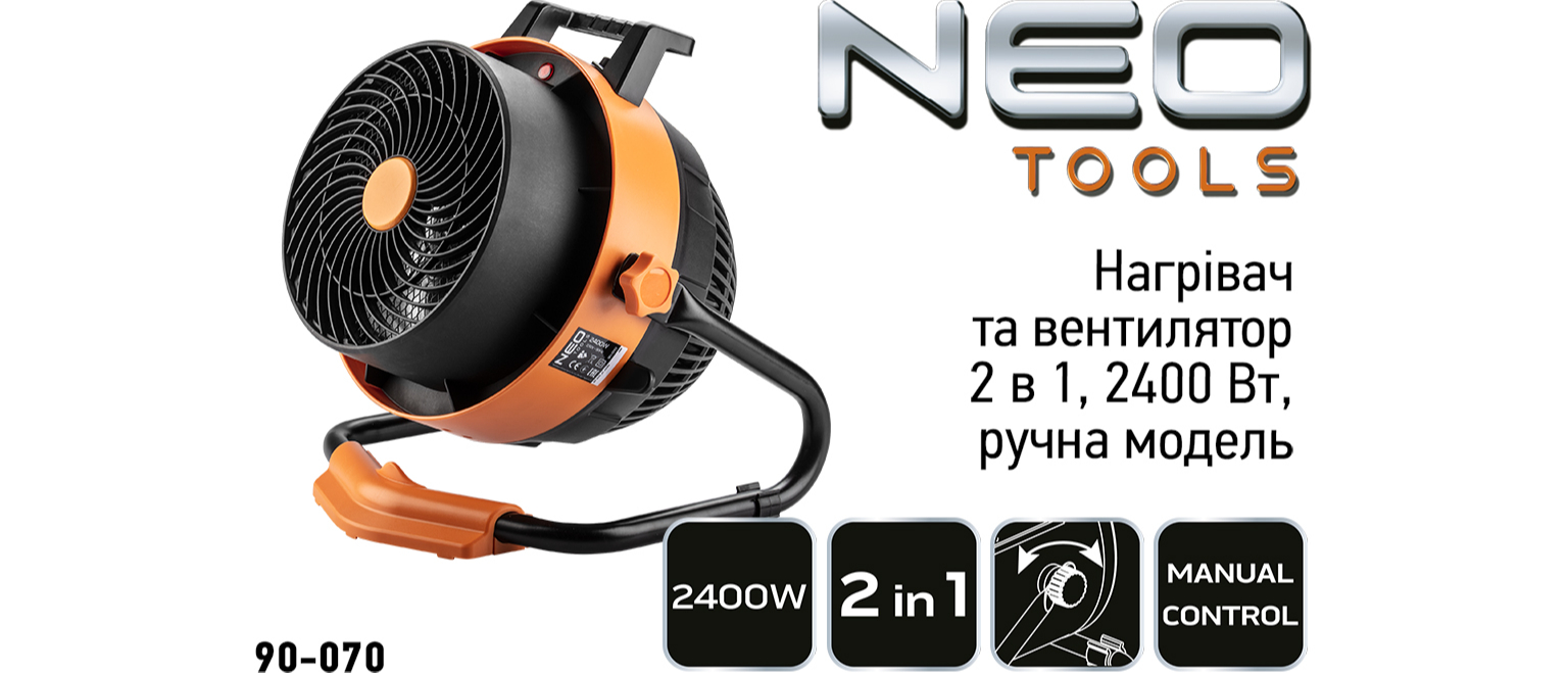 Нагрівач і вентилятор 2 в 1 NEO Tools 90-070 з'єднує функції обігріву і регульованого вентилятора. Нагрівальний елемент пристрою - пружина, що швидко нагрівається. Нагрівач має ізольовану пластикову ручку для зручності перенесення. Корпус виконаний з жароміцного пластика, що запобігає опіки. Пристрій відрізняється високою продуктивністю при невеликій займаній площі.