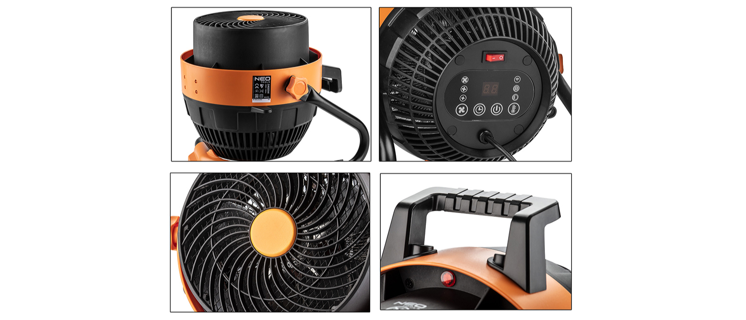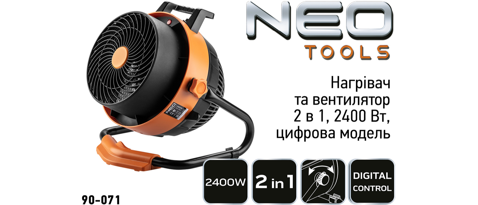 Нагрівач і вентилятор 2 в 1 NEO Tools 90-071 з 24-годинним таймером. Виріб з'єднує функції обігріву та регульованого вентилятора. Нагрівальний елемент пристрою - пружина, що швидко нагрівається. Нагрівач має ізольовану пластикову ручку для зручності перенесення. Корпус виконаний з жароміцного пластика, що запобігає опіки. Пристрій відрізняється високою продуктивністю при невеликій площі.