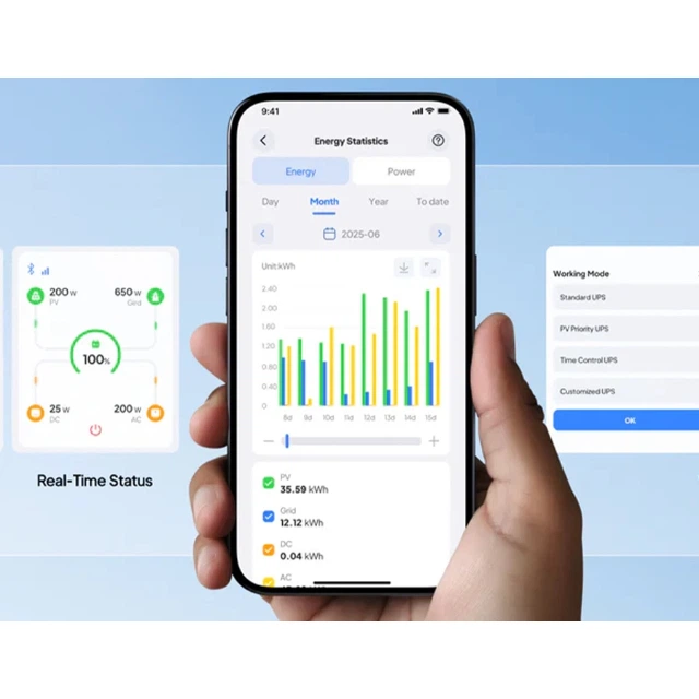 З мобільним додатком BLUETTI App ви маєте повний контроль над станцією. Керуйте швидкістю заряджання, обмеженнями потужності, плануйте роботу за розкладом та відстежуйте показники у реальному часі через Wi-Fi або Bluetooth.