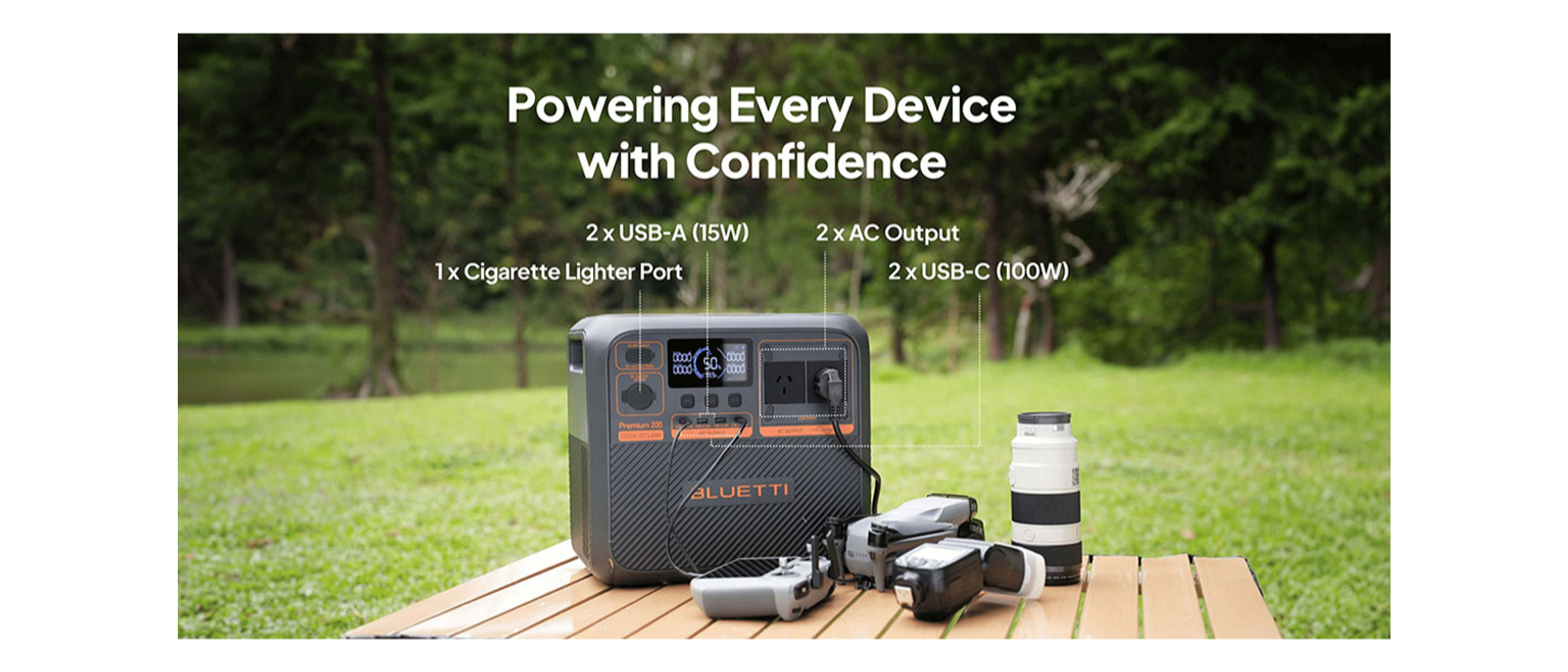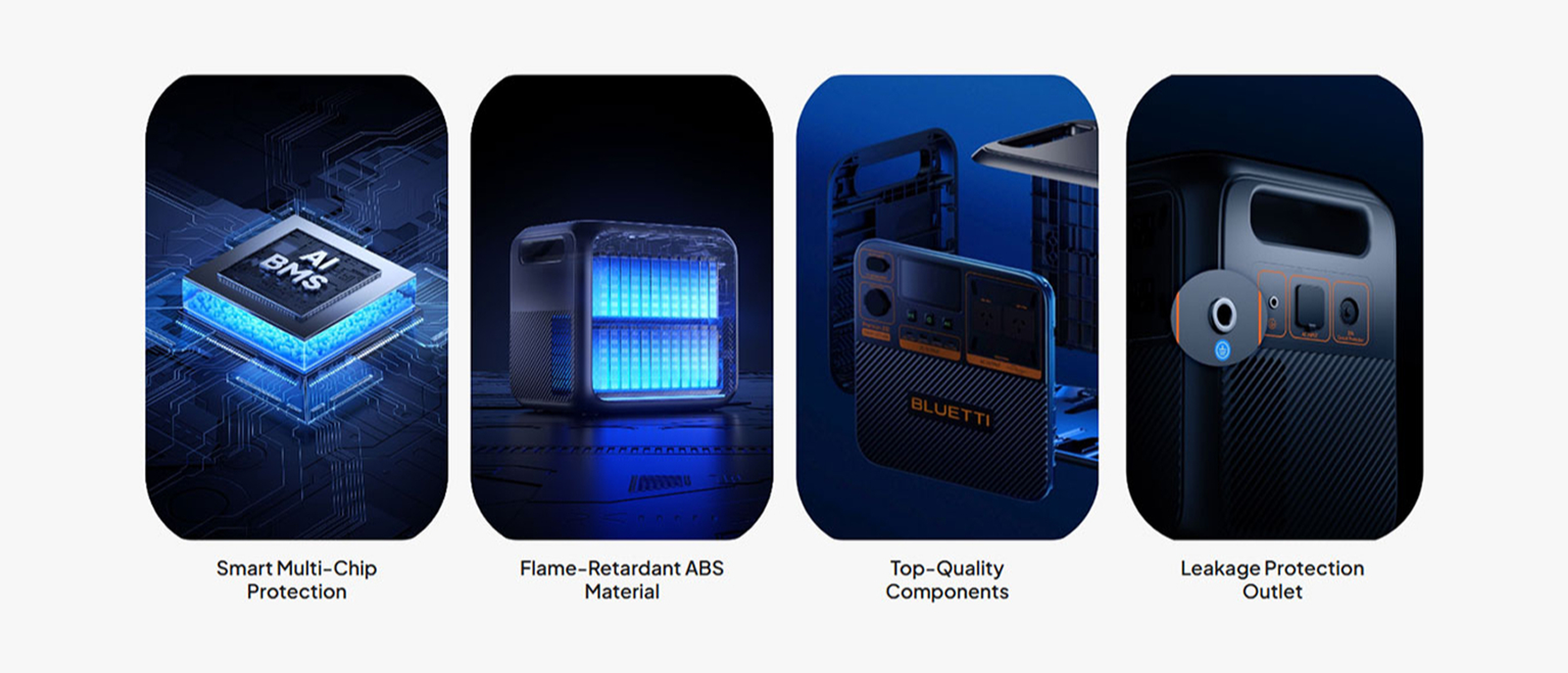 Premium 200 V2 забезпечує живлення та захист завдяки передовим функціям безпеки та високоякісним матеріалам. Його інтелектуальний механізм захисту кількох мікросхем витримує струм до 20 А та 60 В від фотоелектричних входів, запобігаючи перевантаженню по струму та перенапрузі. Вогнестійкий корпус з ABS-пластику та міцні компоненти гарантують тривалу роботу, а розетки із захистом від протікання забезпечують безпеку потужних пристроїв.