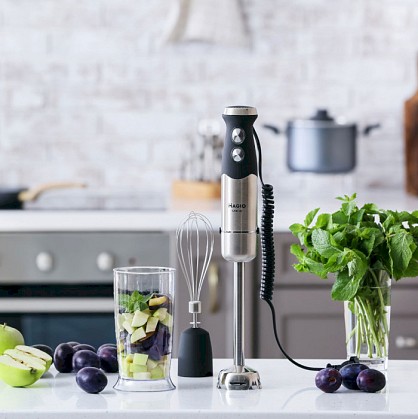 Блендерний набір MG-645 дасть вам змогу урізноманітнити ваше меню і приготувати новий кулінарний шедевр. Потужність блендера становить 1200 Вт, що забезпечує безшумну ефективну роботу впродовж тривалого часу. Заглибна частина зроблена з неіржавкої сталі, а ніж із титановим покриттям — запорука стійкості до зношування й довговічності. Ергономічна ручка з приємним покриттям SOFT TOUCH.